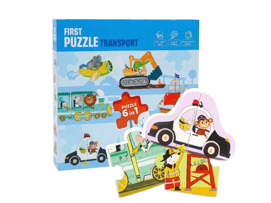 První puzzle Doprava 6v1Svět dopravy s veselými zvířátky – ideální první puzzle pro malé ručičky!Objevte První puzzle pro děti Doprava 6v1 – hravý a vzdělávací set, který pomáhá rozvíjet dětskou zručnost, logiku a koncentraci. Balení obsahuje až 6 různých puzzle - 6 úrovní obtížnosti, od 2 až po 6 dílků, takže jsou ideální i jako první puzzle pro nejmenší.Děti si při skládání užijí spoustu zábavy s veselými zvířátky, která řídí policejní auto, loď, bagr, letadlo, hasičské auto a vlak. Každé puzzle má barevně odlišenou zadní stranu, což dětem usnadňuje třídění dílků a podporuje samostatné skládání.Vhodné pro děti již od 2 let, které se učí spojovat tvary a obrázky poprvé.6 puzzle v jednom balení – radost, učení a rozvoj v každém dílkuPodporuje jemnou motoriku, koordinaci oko–ruka a logické myšleníVyrobeno z hrubého, tvrzeného kartonu – odolné a bezpečné pro malé dětiKvalitní ilustrace se zvířátky v sytých barvách, které děti zaujmou na první pohledErgonomické dílky, které se snadno chytají i nejmenším ručičkám Skvělý tip na dárek pro malé milovníky dopravních prostředků