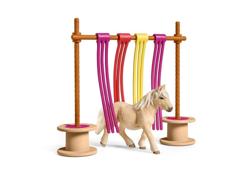 Se závěsem se poník naučí ztrácet svou plachost při průchodu kolem vlajících stuh. Většina poníků se jich velmi bojí a někdy i náhle uskočí na stranu. Když pracuje s mávající oponou, může si poník zvyknout na stuhy a svým vlastním tempem procházet a očichávat je. Průchod vlajícími stuhami je jedno z nejdůležitějších cvičení v tréninku plachosti. Všechny figurky Schleich® jsou modelovány v nejjemnějších detailech, láskyplně malovány a povzbuzují děti ke hře a zároveň k učení. Z tréninkových překážek Cavaletti lze sestavit zeď pro skákání. Sada obsahuje: 1x figurka poníka, sadu překážek. Sada překážek je vhodná jak pro malé, tak pro velké figurky koní. Rozměr cca: 16 x 17 x 14 cm. Rozměr balení: 9 x 5,7 x 13,7 cm. Nevhodné pro děti do 3 let. Doporučený věk: 3-8