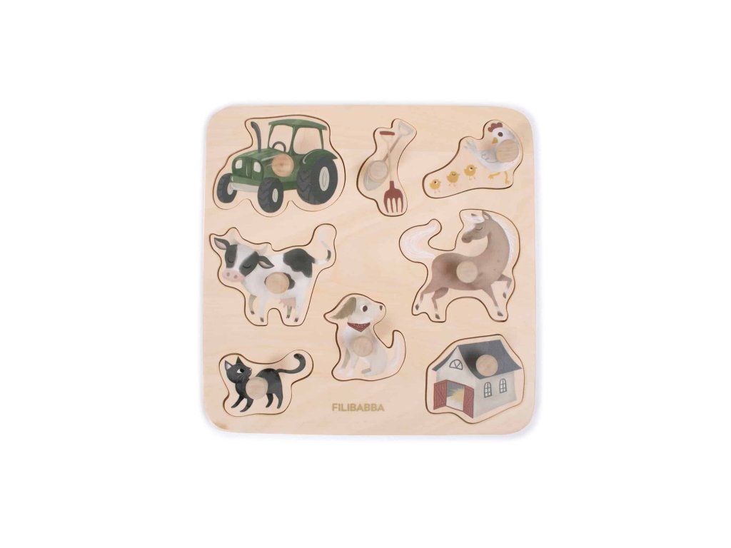 Roztomilé malé 8dílné puzzle s nejoblíbenějšími hospodářskými zvířaty a samozřejmě nezbytným traktorem. Dílky mají úchytky, které usnadní malým ručičkám jejich uchopení.