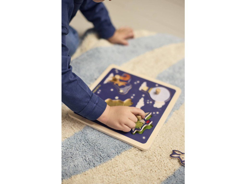 Dřevěná skládačka obsahuje 5 dílků, přičemž každý motiv pod sebou ukrývá senzorickou látku. Pevná madla umožňují malým prstům snadné uchopení, podporují rozvoj jemné motoriky a posilují pinzetový úchop. S rozměry 22,5 × 22,5 cm kombinuje hmatové objevování s řešením problémů a je ideální aktivitou pro děti od 12 měsíců.