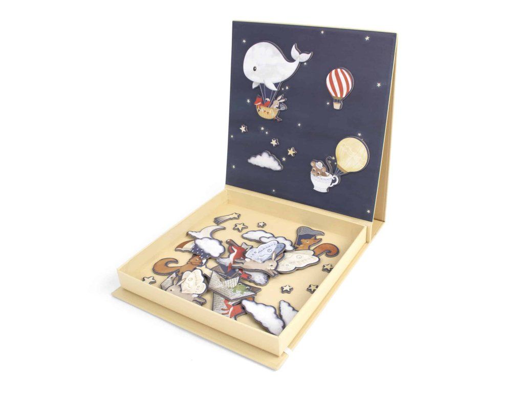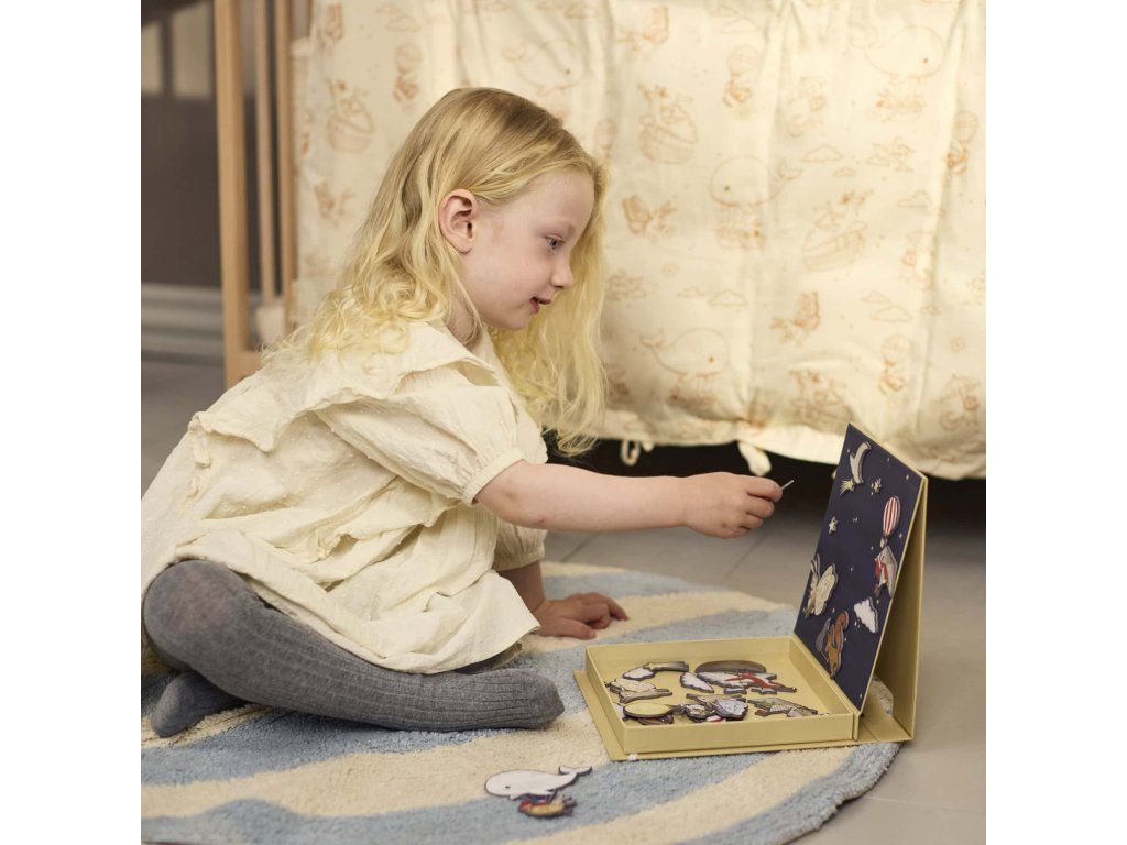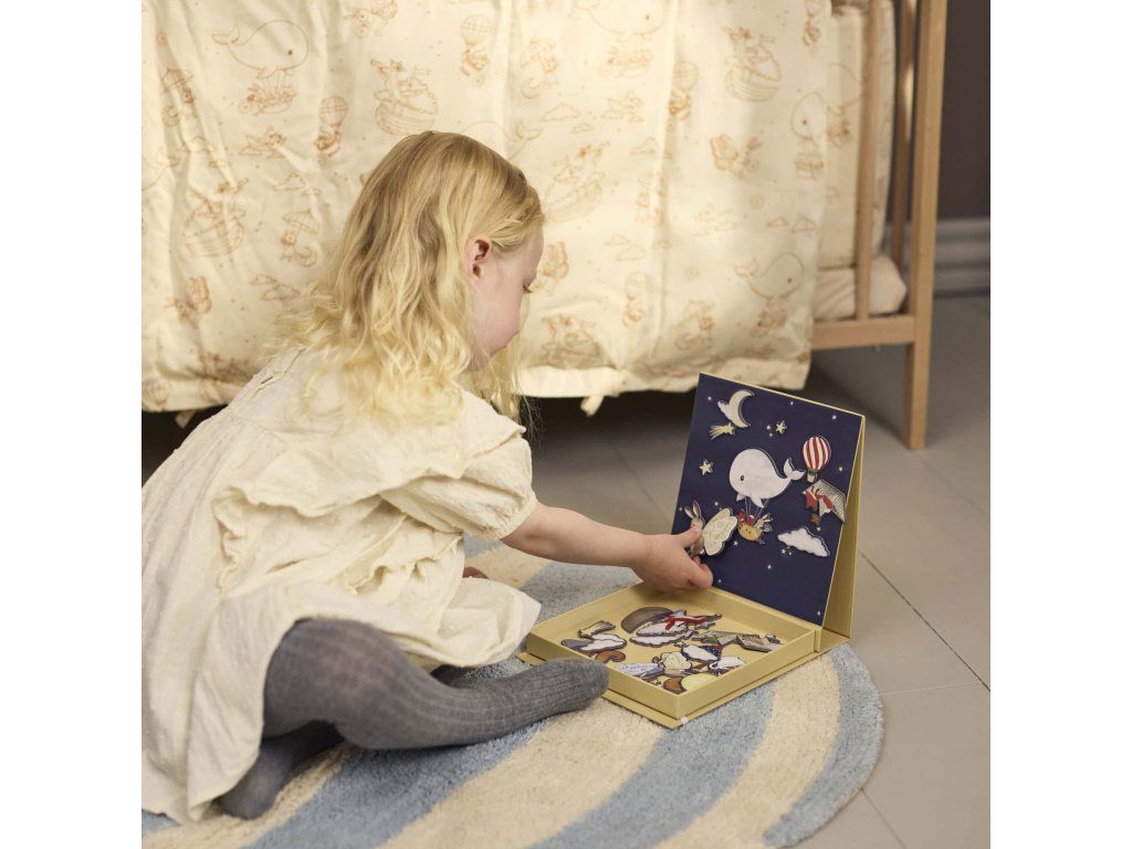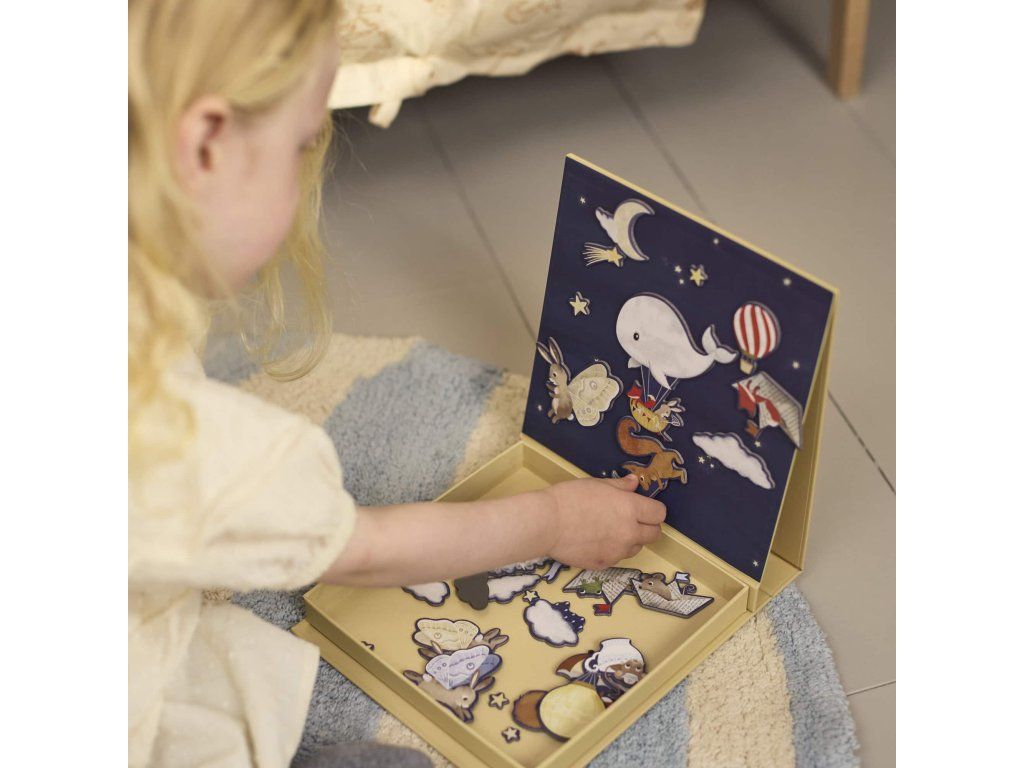S okouzlujícím pozadím hvězdné oblohy zve tato kouzelná magnetická hra děti, aby vytvářely vlastní pohádkové scény. Díky pestrým, ručně kresleným postavičkám a hravým prvkům je dokonalou kombinací rozvoje fantazie, vyprávění příběhů a jemné motoriky. Zabalena je v praktické krabičce s vestavěnou magnetickou tabulkou, takže ji můžete jednoduše vzít s sebou na cesty a všechny dílky zůstanou bezpečně na místě.
