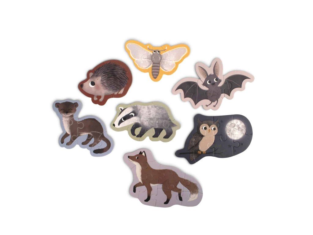 Tato sada puzzle obsahuje sedm rozkošných skládaček s narůstajícím počtem dílků, které jsou výzvou i potěšením pro vaše dítě. Vychutnejte si ručně kreslené ilustrace různých nočních zvířat, které ožijí, když se zhasnou světla a zářivě svítí ve tmě.