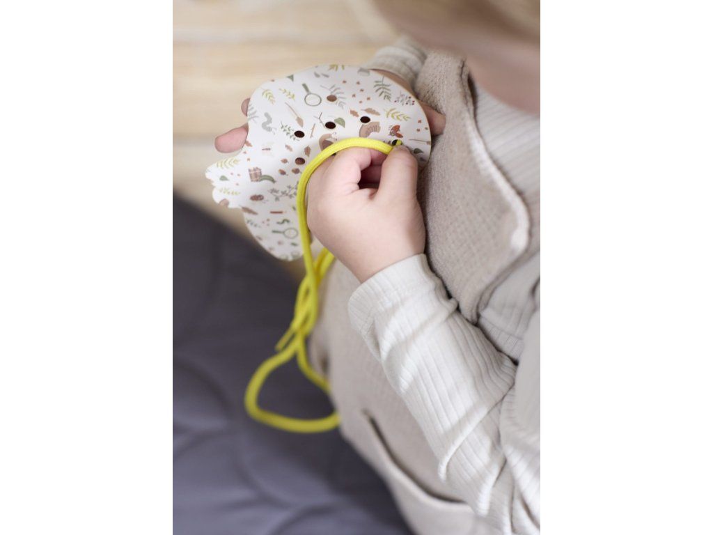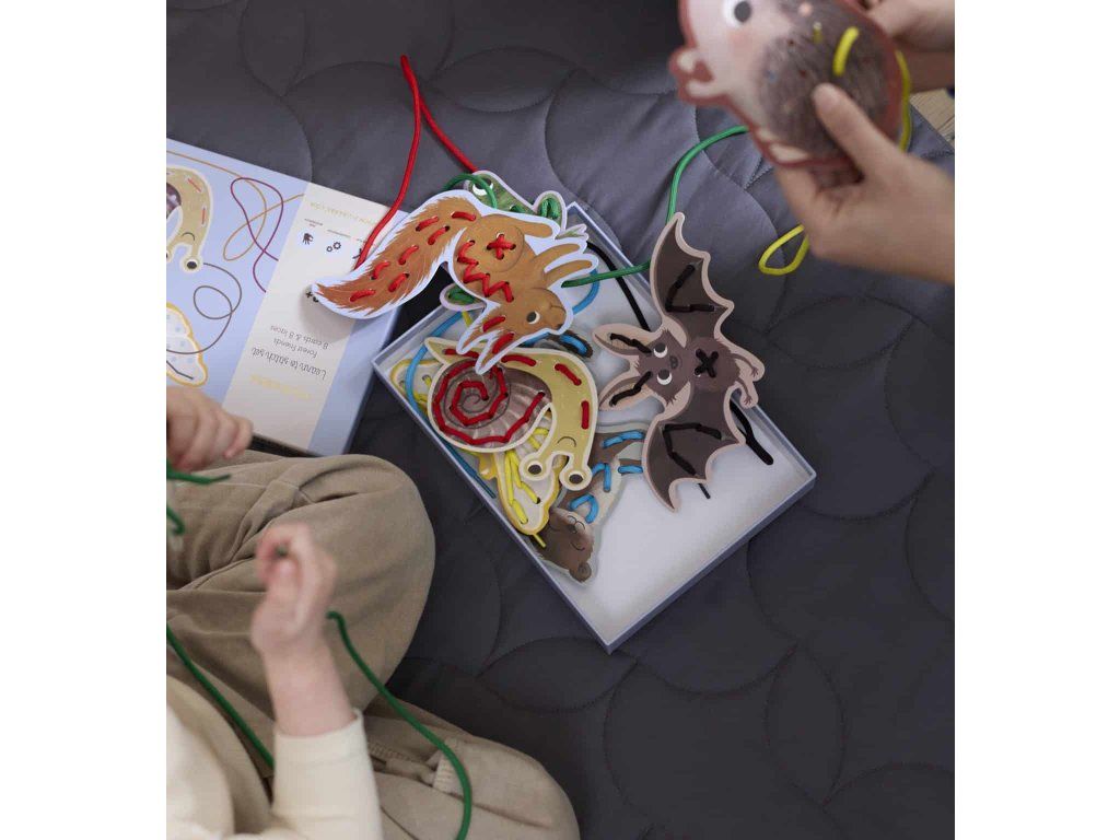 Barevné šňůrky propletete pouze pomocí prstů skrz předděrované otvory v osmi nádherně ručně ilustrovaných zvířecích šablonách. To vám umožní vytvářet krásné vzory a zároveň bez námahy zlepšovat své dovednosti.