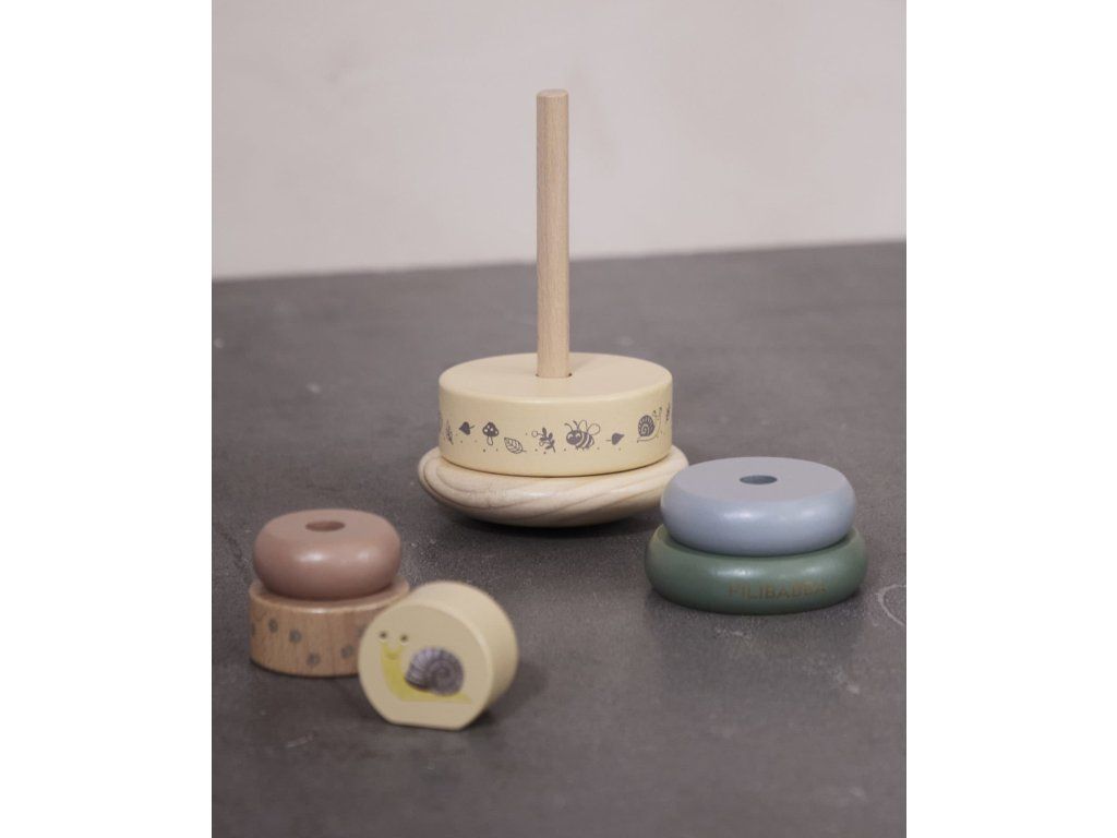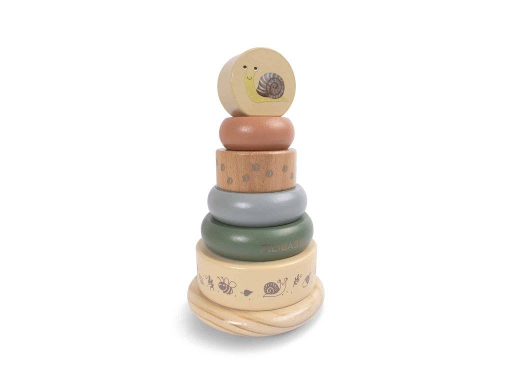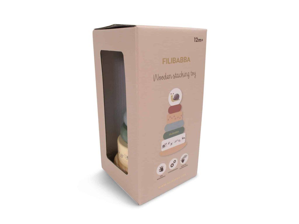 Stohovací hračka s okouzlujícími dřevěnými detaily se dodává krásně zabalená v papírové krabičce.