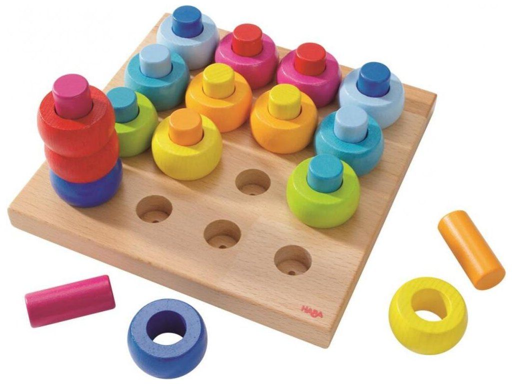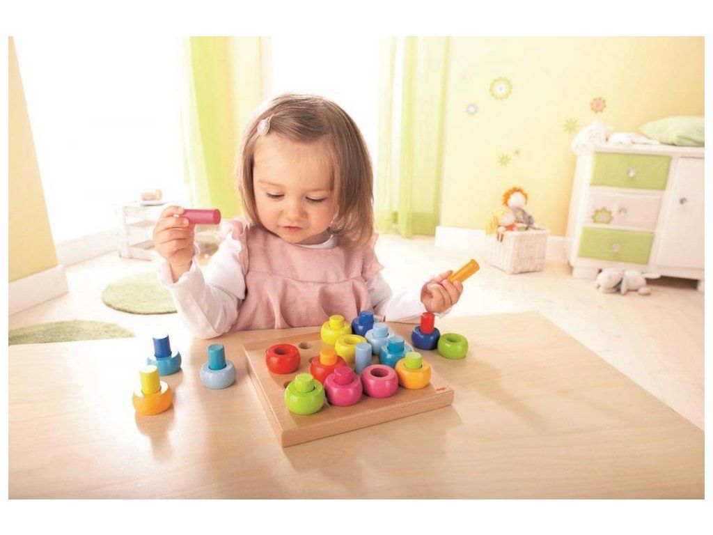 Dřevěná vkládačka s barevnými kolíčky a kroužky.