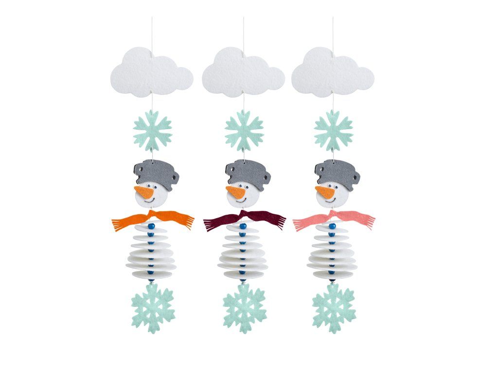 3 sněhuláci (každý ze 7 kruhů, hlava, mrkev, 2 klipovací očička, šála, 7 dřevěných korálků), 3 obláčky, 6 sněhových vloček, 3 m nití na navlékání, plastová jehla a návod k použití.