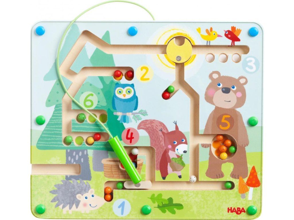 Kdo by chtěl jít na procházku lesem? Malí průzkumníci mohou pomocí magnetického pera posouvat malé barevné kuličky přes koruny stromů a přes lesní porost k příslušnému lesnímu zvířátku.
