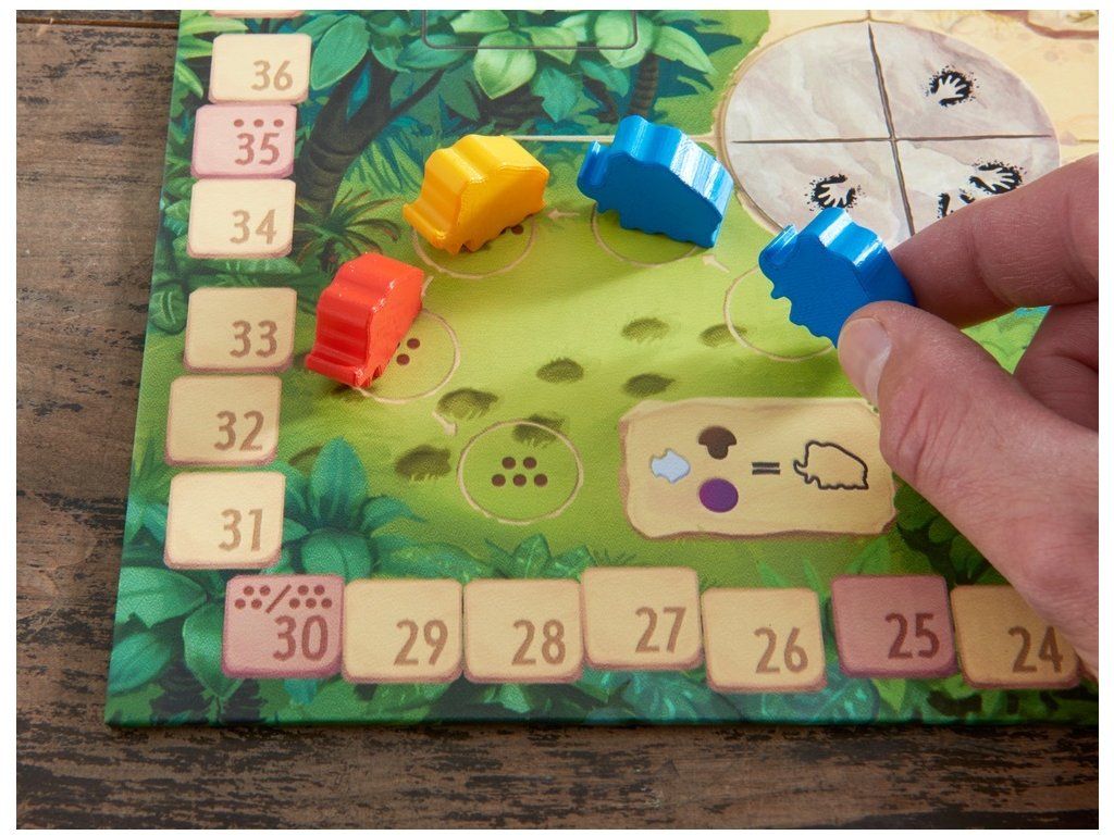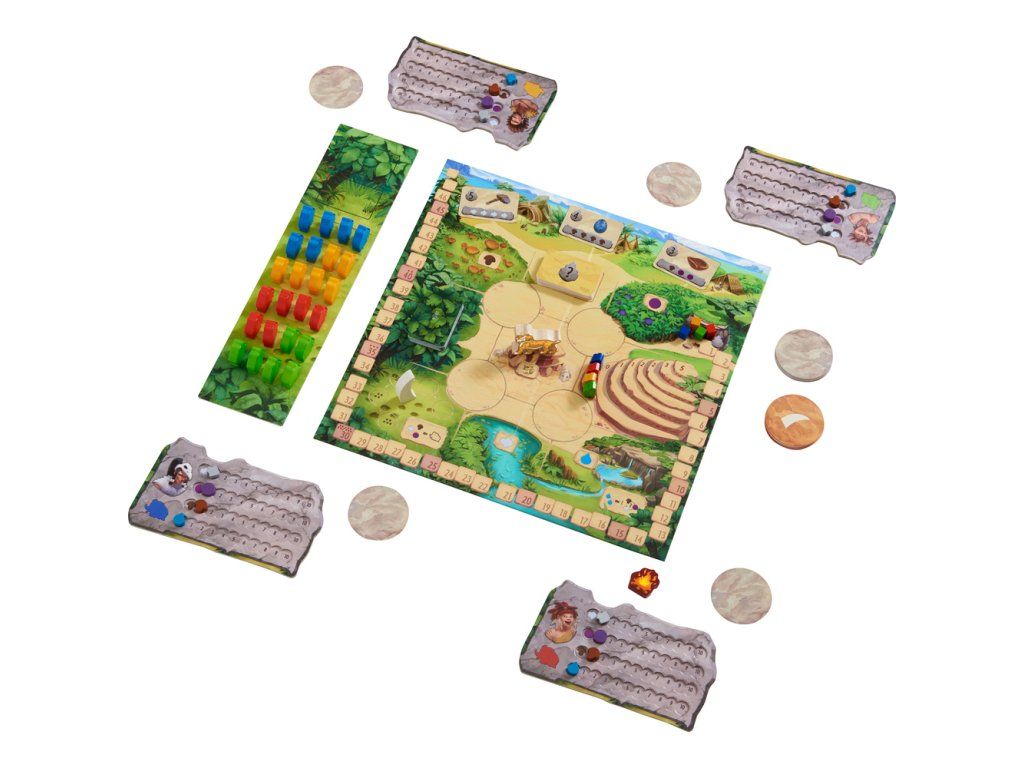 Hra obsahuje: 1 hrací deska, 1 deska zásob, 5 desek hráčů, 46 akčních žetonů (28 x šedých, 18 x červených) 25 bonusových karet, 32 karet výměny, 1 značka začínajícího hráče, 1 mamutí kel, 1 figurka tygra Honga, 30 mamutů, 5 jeskynních mužů, 5 bodovacích kostiček, 20 surovin (5 ryb, 5 bobulí, 5 hub, 5 kapek vody), pravidla hry.
