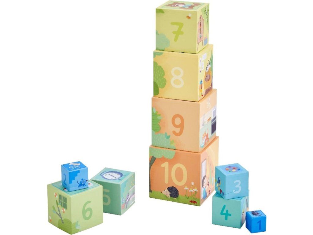 Extra nápad na hru: Kdo najde motivy na vrchu kostek na každém patře? Kostky jsou vyrobeny z pevného kartonu a děti je snadno uchopí, takže jejich skládání je zábavné. Dají se také rychle uklidit, protože se dají naskládat do sebe a zanechají za sebou velkou kostku.