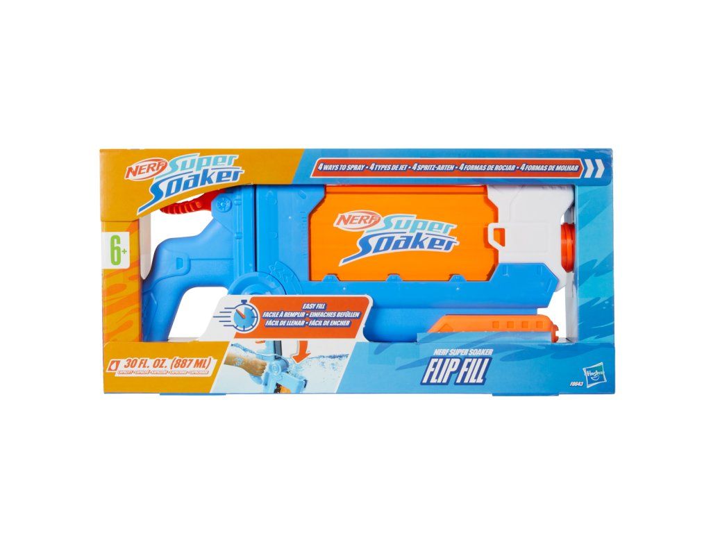 Vodní pistole Nerf Super Soaker Flip Fill nabízí 4 různé režimy proudění vody, takže si můžete vybrat ten nejlepší způsob, jak osvěžit přátele a rodinu během zahradní vodní zábavy. Jednoduše otočte trysku na pistoli a vypusťte úzký jednotlivý proud, silný široký proud, rozptýlenou záplavu, nebo vodní postřik ve tvaru vějíře s úhlovým rozptylem. Pistole má konstrukci s rychlým plněním, takže budete během okamžiku připraveni na venkovní hry. Pomocí pumovací rukojeti pak snadno aktivujete silný proud vody. Nádrž na vodu má kapacitu až 880 ml. Vodní blastery Nerf Super Soaker jsou ideální venkovní hračky pro děti, které skvěle oživí každou letní aktivitu. Jsou perfektním dárkem, který motivuje k pohybu a zábavě na čerstvém vzduchu, a to s pořádným šploucháním! Vyrobeno z kvalitního plastu. Baleno v krabičce. Rozměr balení: 21,6 x 45,7 x 6,7 cm. Věk: 6+
