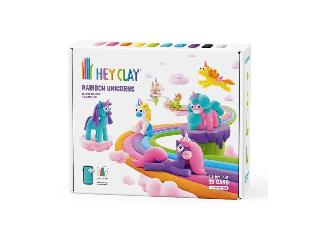 Hey Clay Jednorožci Vymodelujte si originální postavičky jednorožců Modelovací hmota Hey Clay je ideální pro všechny děti, které milují kreativní tvoření. Díky jemné a voňavé modelovací hmotě si mohou vytvořit originální postavičky jednorožců a jiné různé figurky, podle vlastní fantazie. Po vymodelování stačí nechat postavičky zatvrdnout na vzduchu přibližně 24 hodin, čímž se promění v pevné figurky a jsou připraveny na další dobrodružství a hry.Objevte inspirace v aplikaci a vytvořte si postavičky přesně podle návodu Sada obsahuje 15 nádobek barevné plastelíny a 2 plastové pomůcky pro jednodušší modelování. Navíc, přístupový kód do aplikace umožňuje dětem inspirovat se novými nápady a vytvořit 6 různých postaviček přesně podle návodu. Pokud děti nejsou se svým výtvorem spokojené, Hey Clay mohou jednoduše uložit zpět do kelímku a pokračovat v modelování později. Děti si při hře trénují své dovednosti, jemnou motoriku a rozvíjejí fantazii.