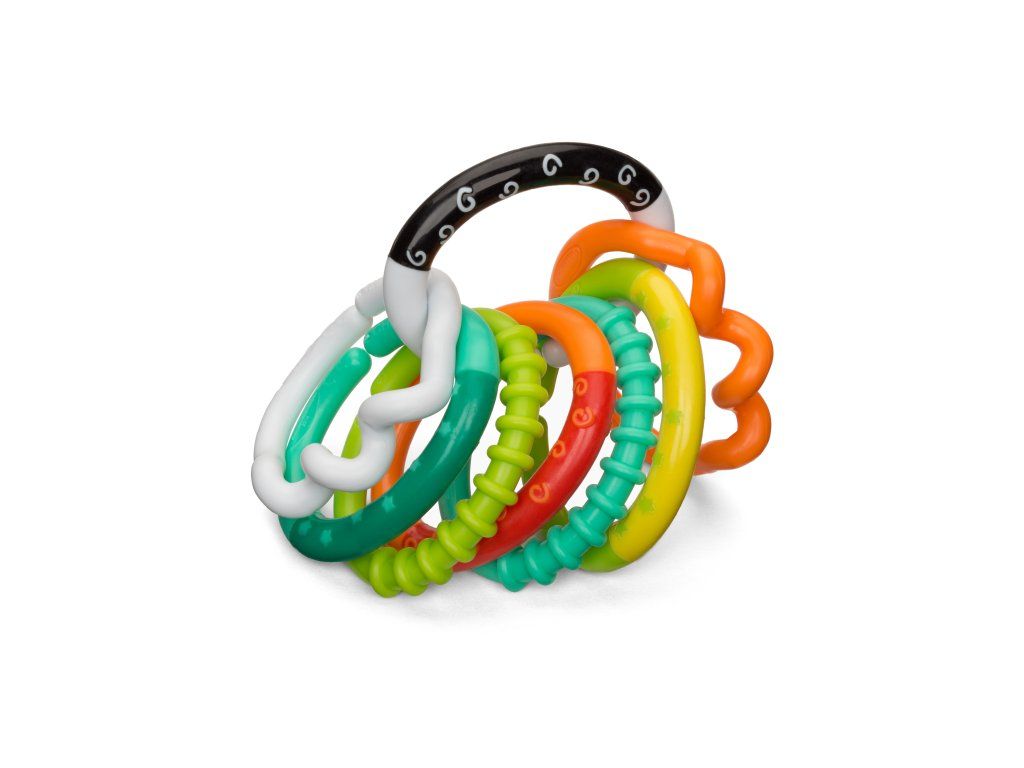 Lehký a snadno uchopitelný chrastítko pro nejmenší je tvořeno osmi vzájemně propojitelnými kroužky, které můžete různými způsoby spojovat i používat samostatně. Každý kroužek nabízí jinou texturu ke zkoumání rukama i ústy.