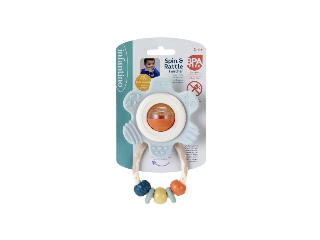 Chrastítko Infantino ve tvaru květu má tvar pro snadné uchopení. Pozornost dítěte upoutají pohyblivé různobarevné kroužky na rukojeti i chrastící korálky v průhledné kuličce uprostřed hračky. Okvětní lístky květu slouží jako kousátka, které dítěti pomohou při prořezávání prvních zoubků.