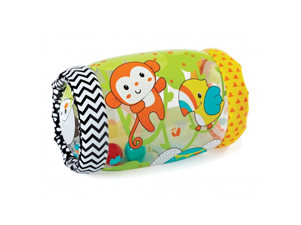 Nafukovací, extrémně lehký válec podněcuje dítě k pohybu, láká ho k lezení, sezení i prvním krůčkům. Pozornost dítěte upoutají cinkající rolničky uvnitř válce i výrazný potisk s barevnými obrázky zvířátek.