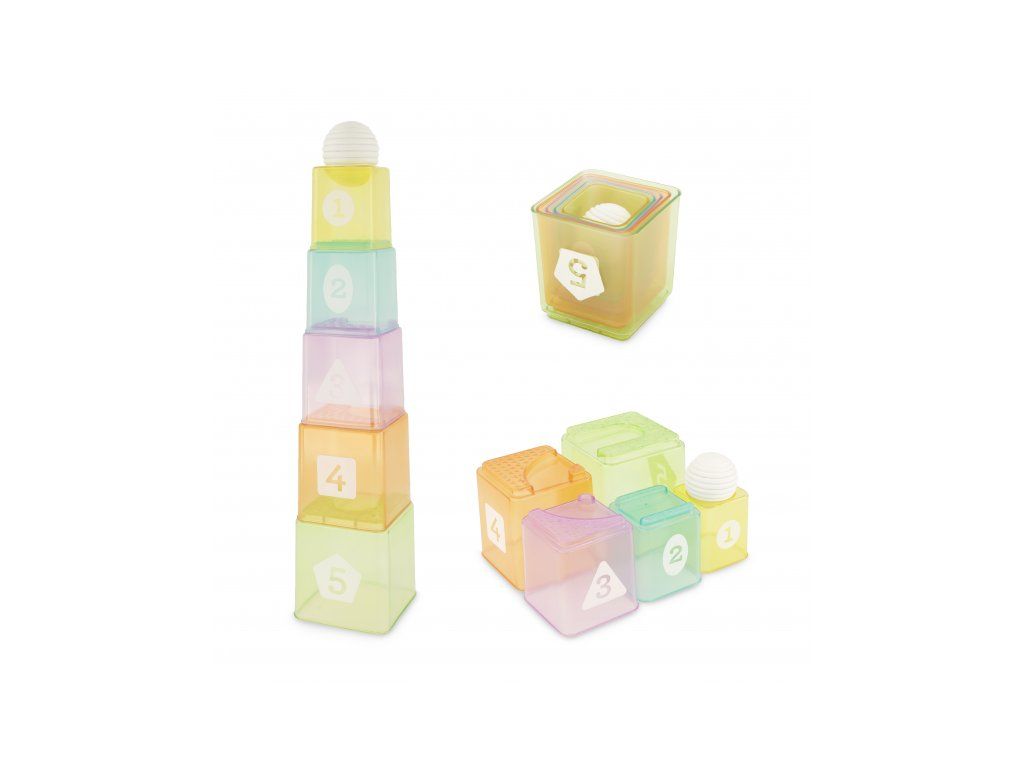 Sada obsahuje jeden míček a pět barevných stohovacích kelímků, které můžete stavět až do výšky nebo naopak vkládat do sebe. Průhledné kelímky jsou potištěny geometrickými tvary a čísly a můžete tak s jejich pomocí batole učit rozeznávat barvy, tvary i čísla. S míčkem můžete vymýšlet různé hry na schovávanou, kdy dítě bude např. hledat míček ukrytý pod kelímky.