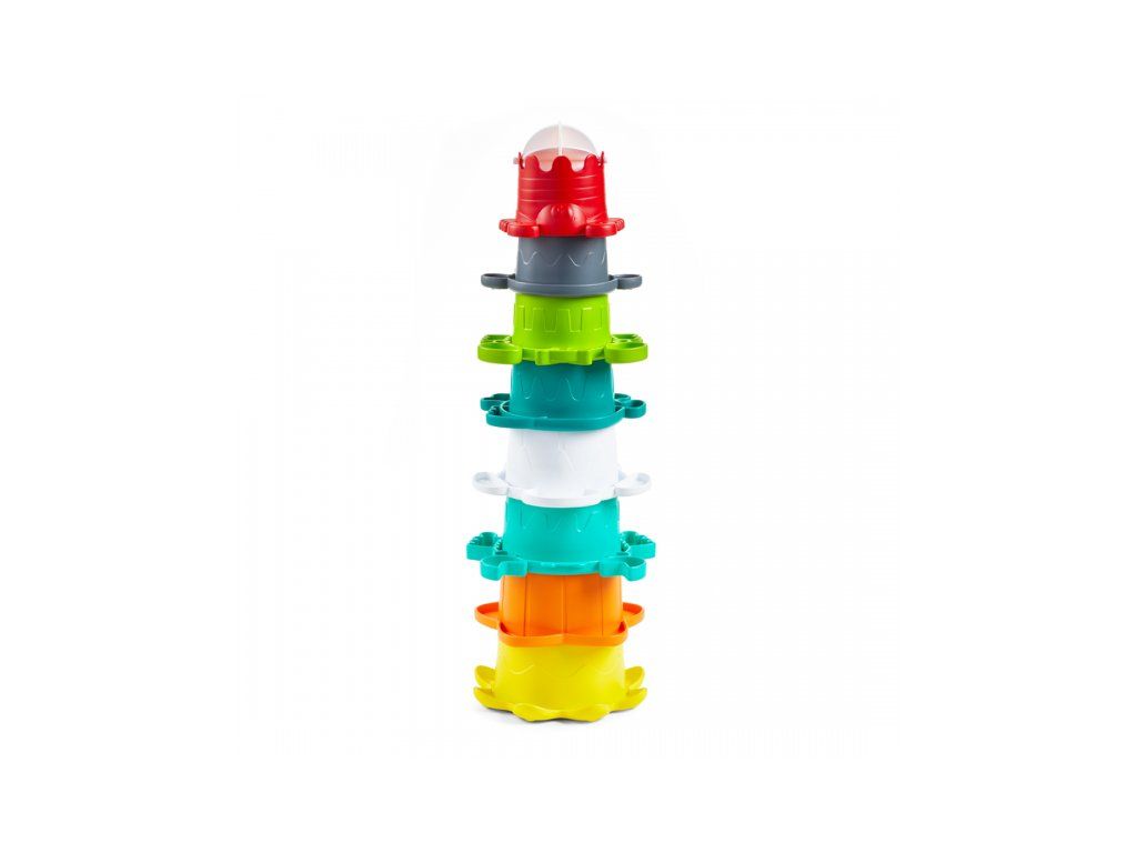 Sada barevných kelímků originálního tvaru přinese vašemu dítěti spoustu zábavy při hraní ve vodě během koupání ve vaně i v bazénku či na pláži. Osm očíslovaných kelímků s perforovaným dnem je možné skládat do sebe i do výšky. Jednotlivé kelímky mají tvar květu, hvězdice, kraba, želvy, humra či ryby. Součástí nejmenšího kelímku je vodní mlýnek.