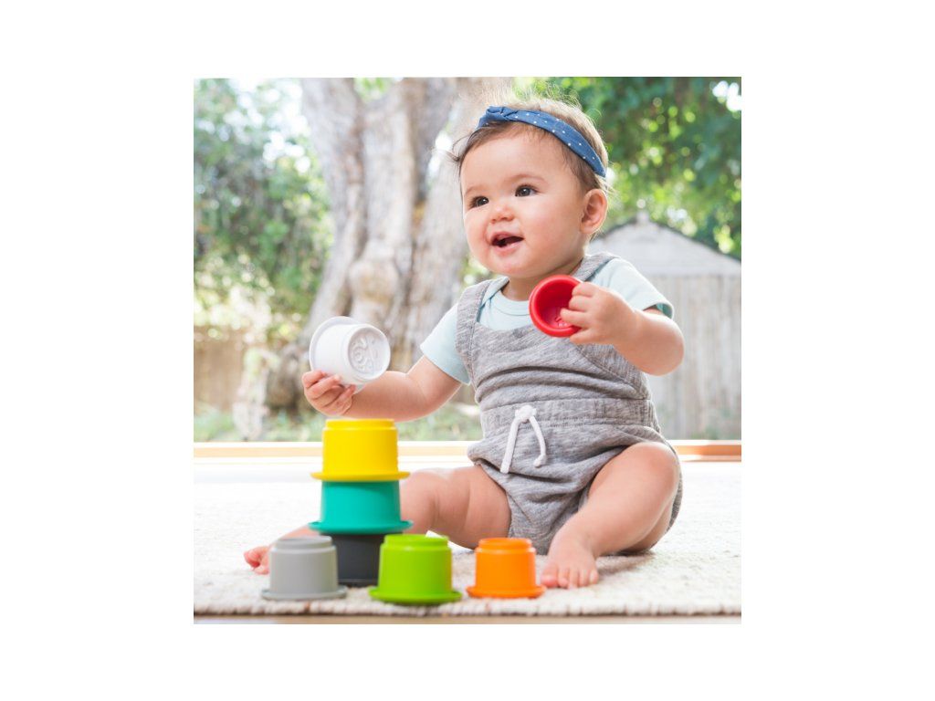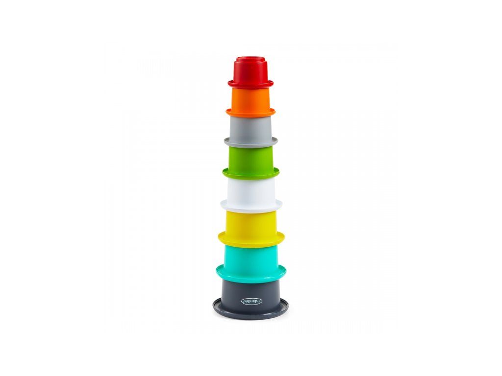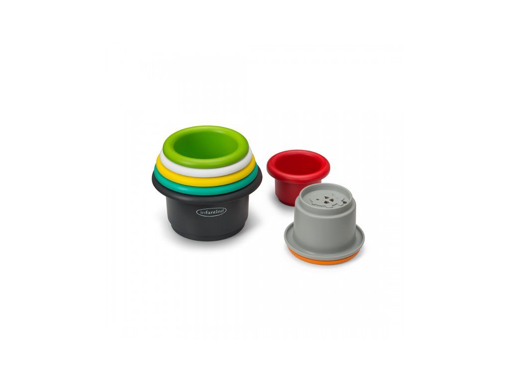 Osm různobarevných kelímků v originálním provedení má perforované dno s plastickým obrázkem zvířátka. Naučte dítě stavět z kelímků vysokou věž, kterou pak může jedním mávnutím ruky zase zbořit, poznávejte spolu zvířátka i barvy nebo kelímky využijte pro hraní s vodou během koupele.