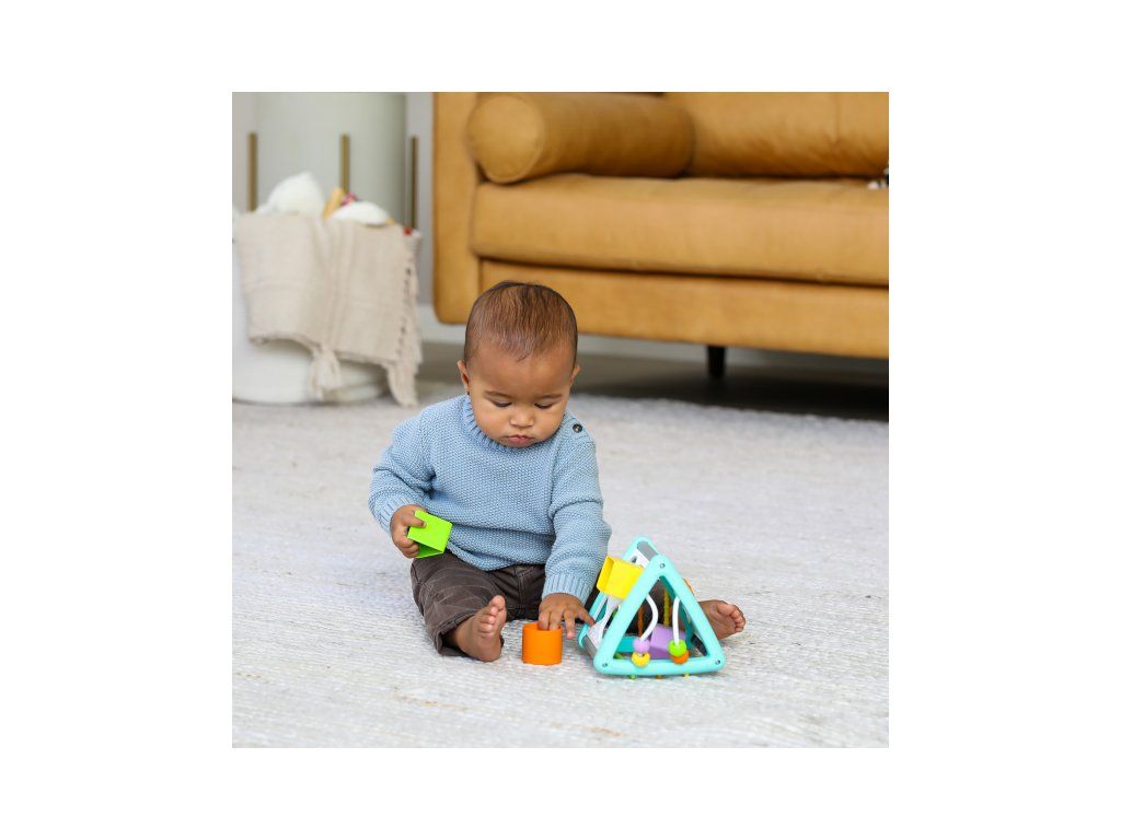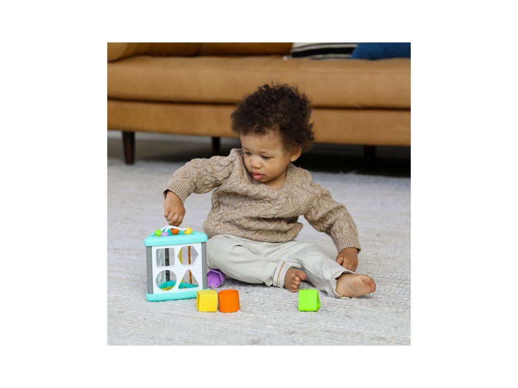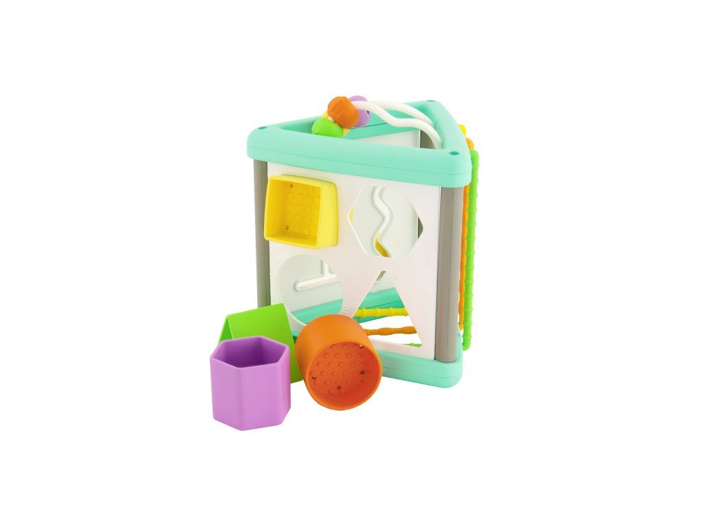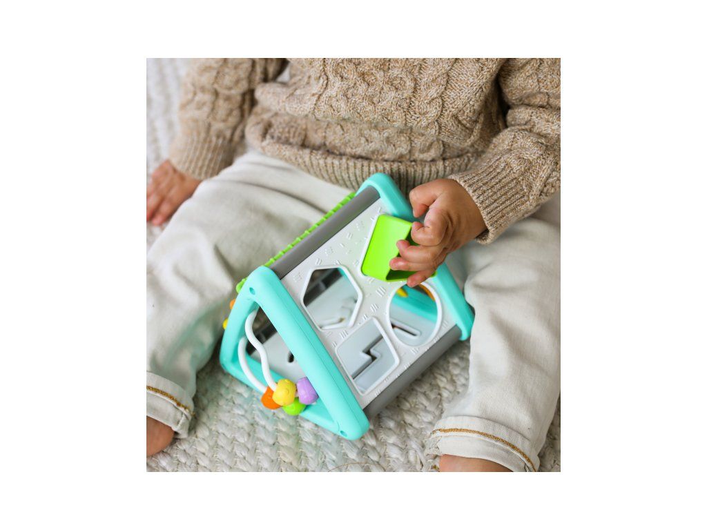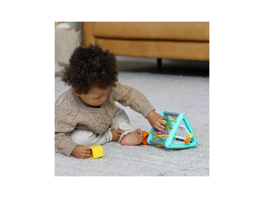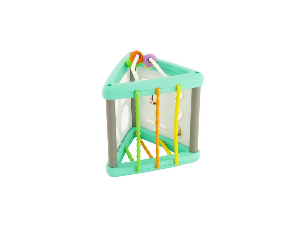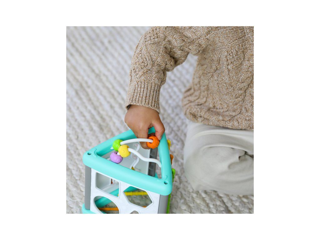 Interaktivní hračka nabízí pět stran zábavných aktivit včetně otvorů pro čtyři barevné vkládací tvary. Pohyblivé korálky a pružné barevné hadičky s různými texturami budou také lákat ke zkoumání.