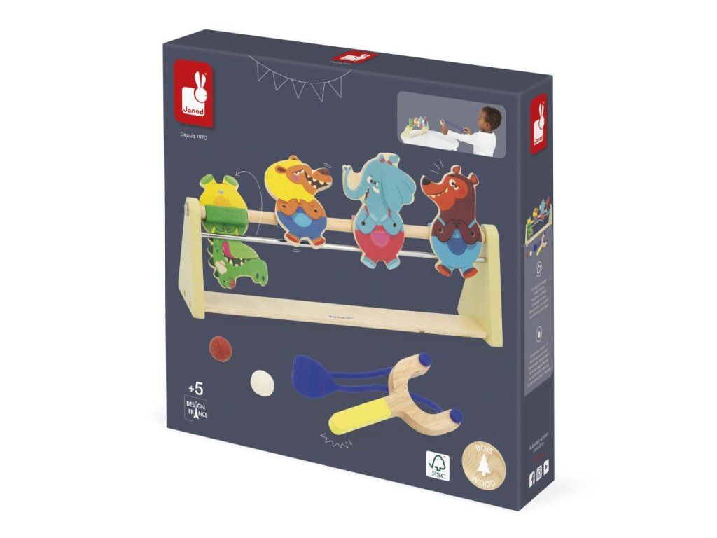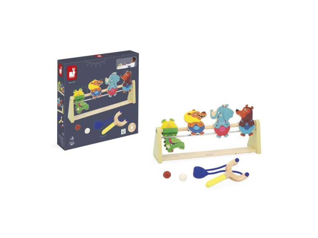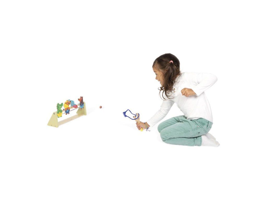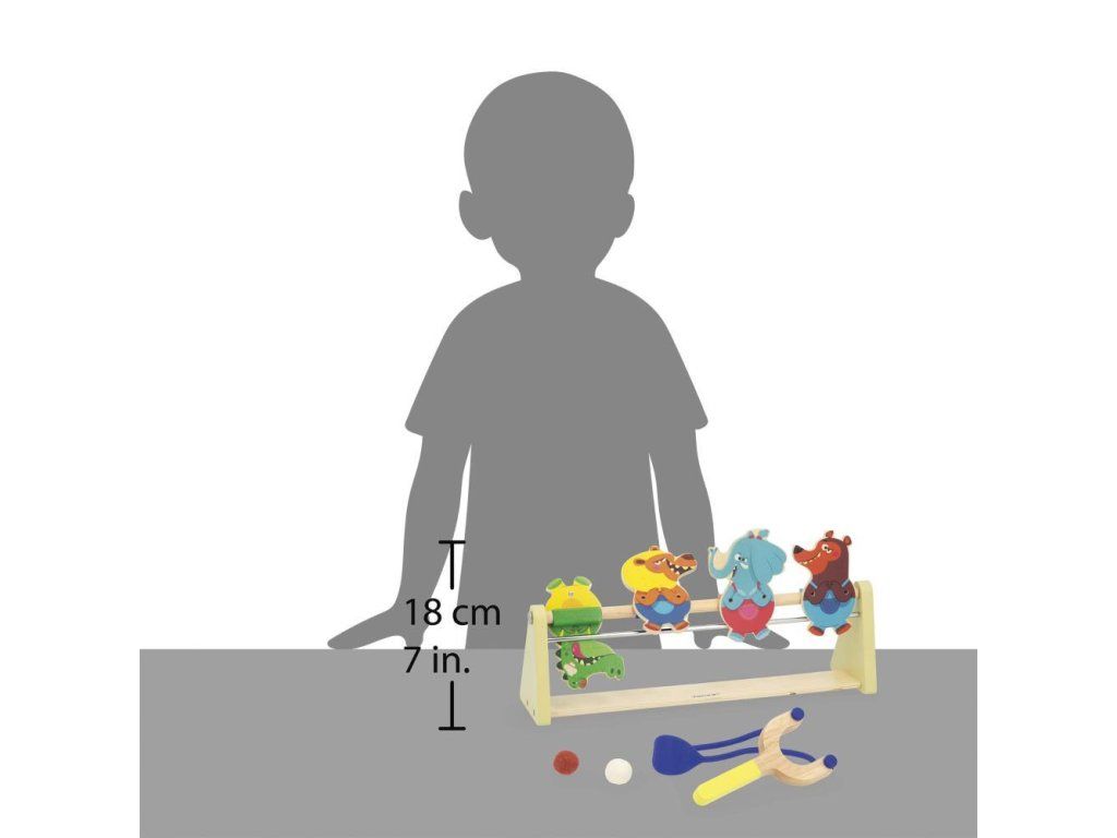 Pomocí vystřelovače a dvou plstěných kuliček se pokuste srazit terče. Díky magnetickému systému zvířecí terče po zásahu spadnou dozadu.