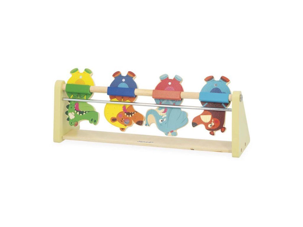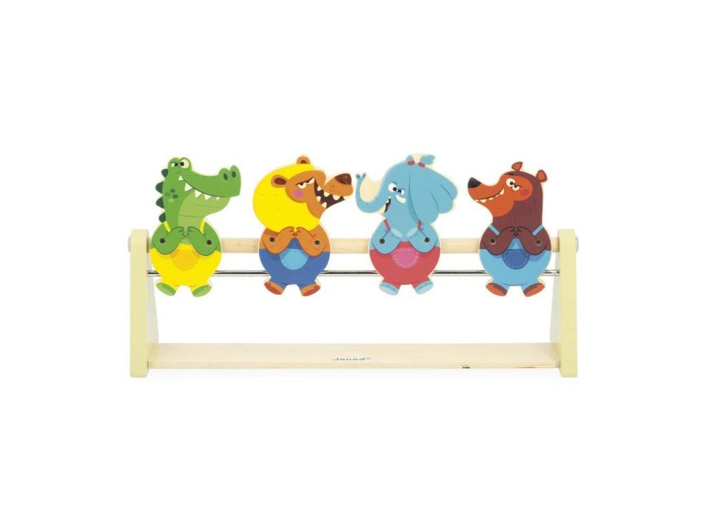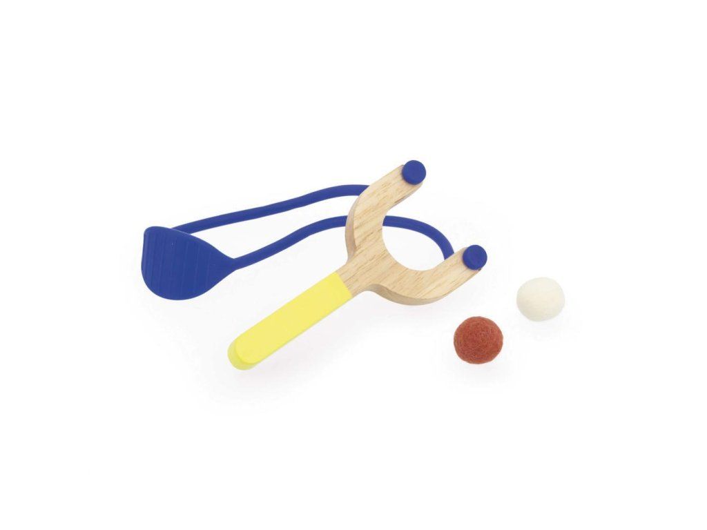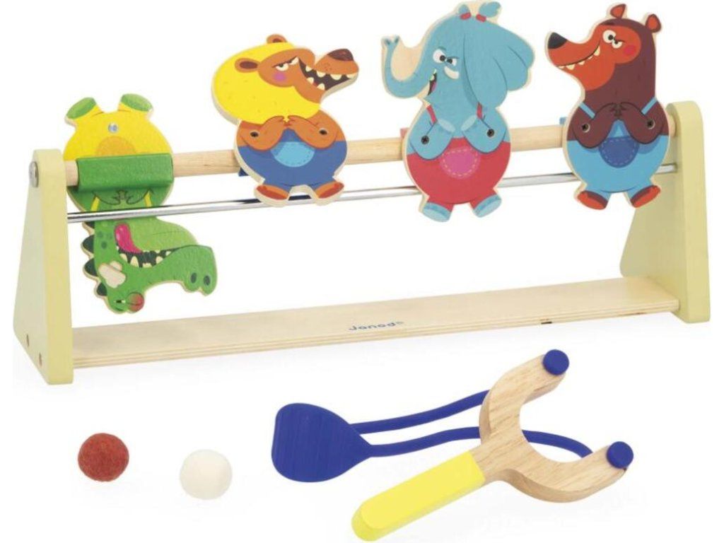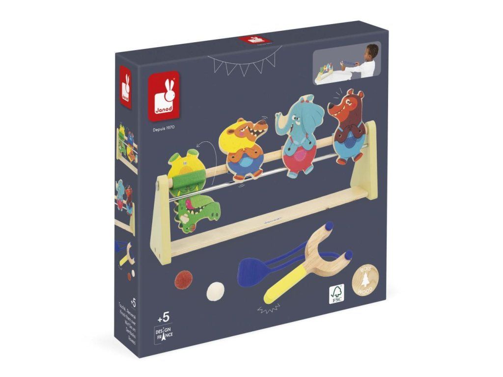 Pomocí vystřelovače a dvou plstěných kuliček se pokuste srazit terče. Díky magnetickému systému zvířecí terče po zásahu spadnou dozadu.