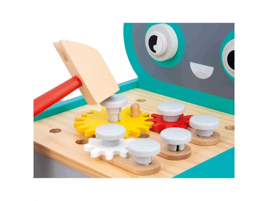 Potěšující! Zde je velmi přátelský robotický vozík, rychlý a vybavený nástroji a příslušenstvím! Tento vozík pro kutily znamená, že vaše dítě může pracovat po celém domě. Je vybaven svěrákem a šikovným systémem dřevěných magnetických nástrojů pro snadné uložení v přední části vozíku.