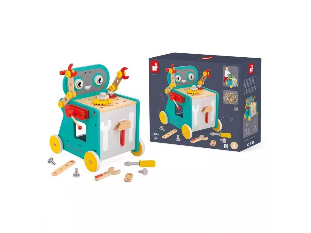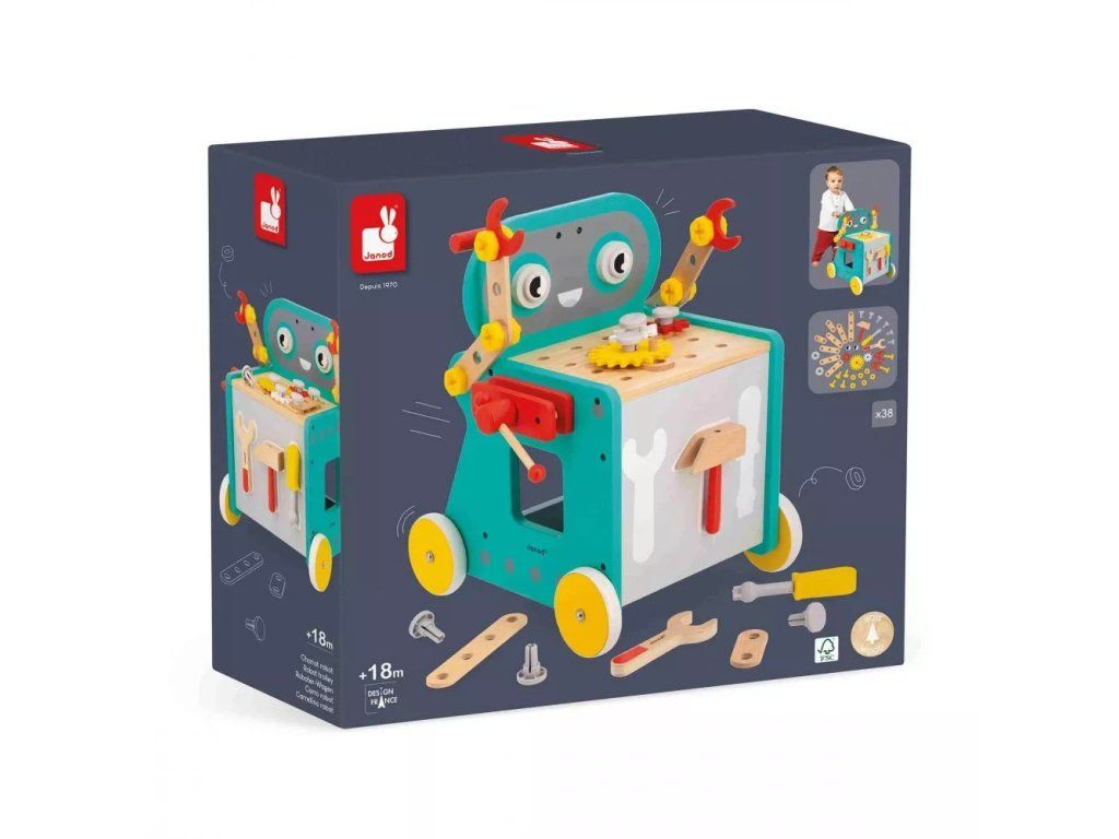Janod BricoKids Dřevěné chodítko a vozík s nářadím Robot 38 ks