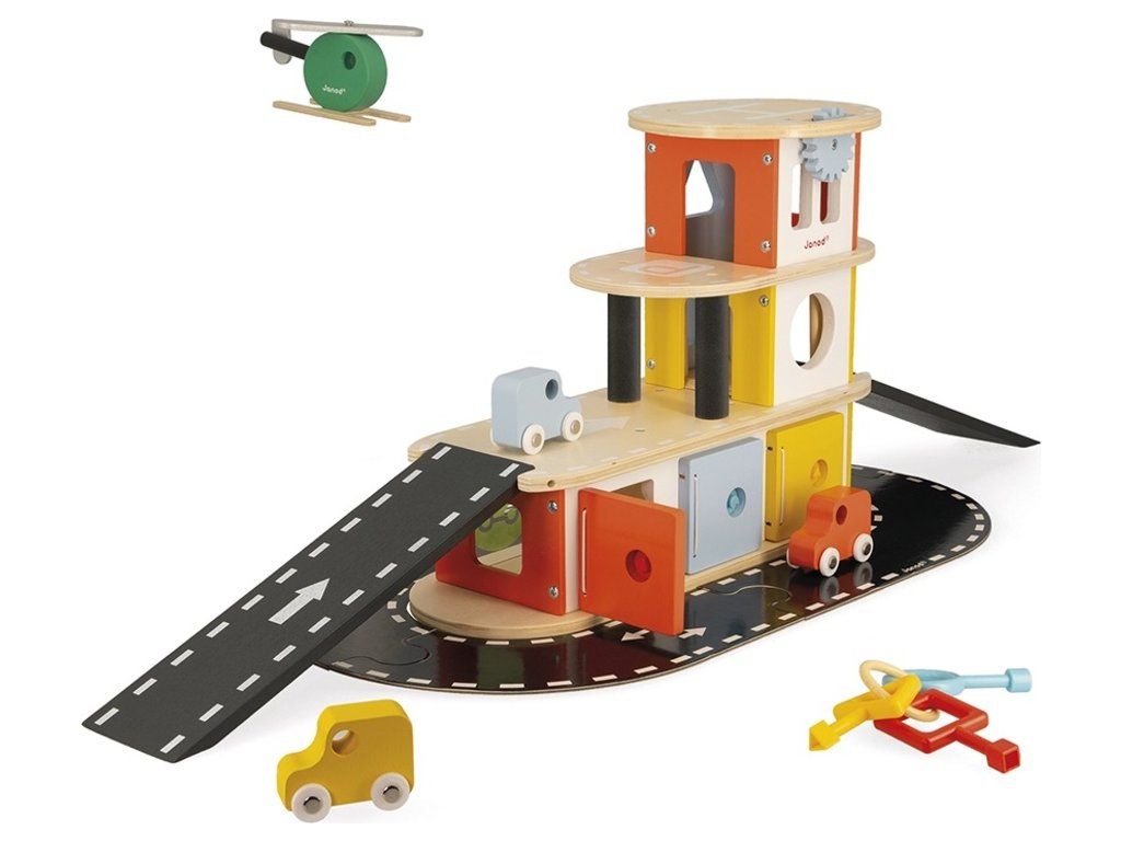 Hodiny hry jsou zaručeny s touto dřevěnou garáží a s jejími 3 auty a vrtulníkem.