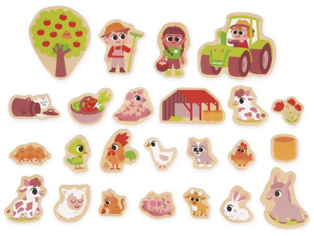 Sada dřevěných magnetek On the Farm od francouzské značky Janod je skvělým dárkem pro batole. Sada obsahuje 24 magnetů různých velikostí souvisejících s farmářskou tématikou, včetně: zvířátek, farmářů a traktoru.