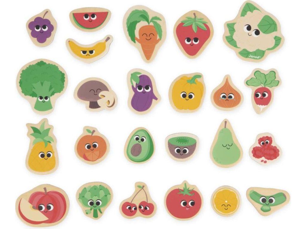 Magnety na ovoce a zeleninu od Janod obsahují 24 barevných magnetů ve tvaru různých druhů ovoce a zeleniny.