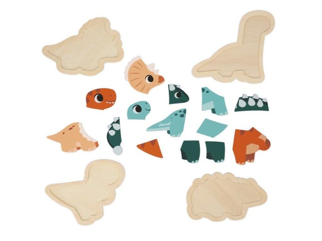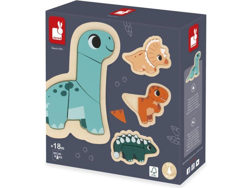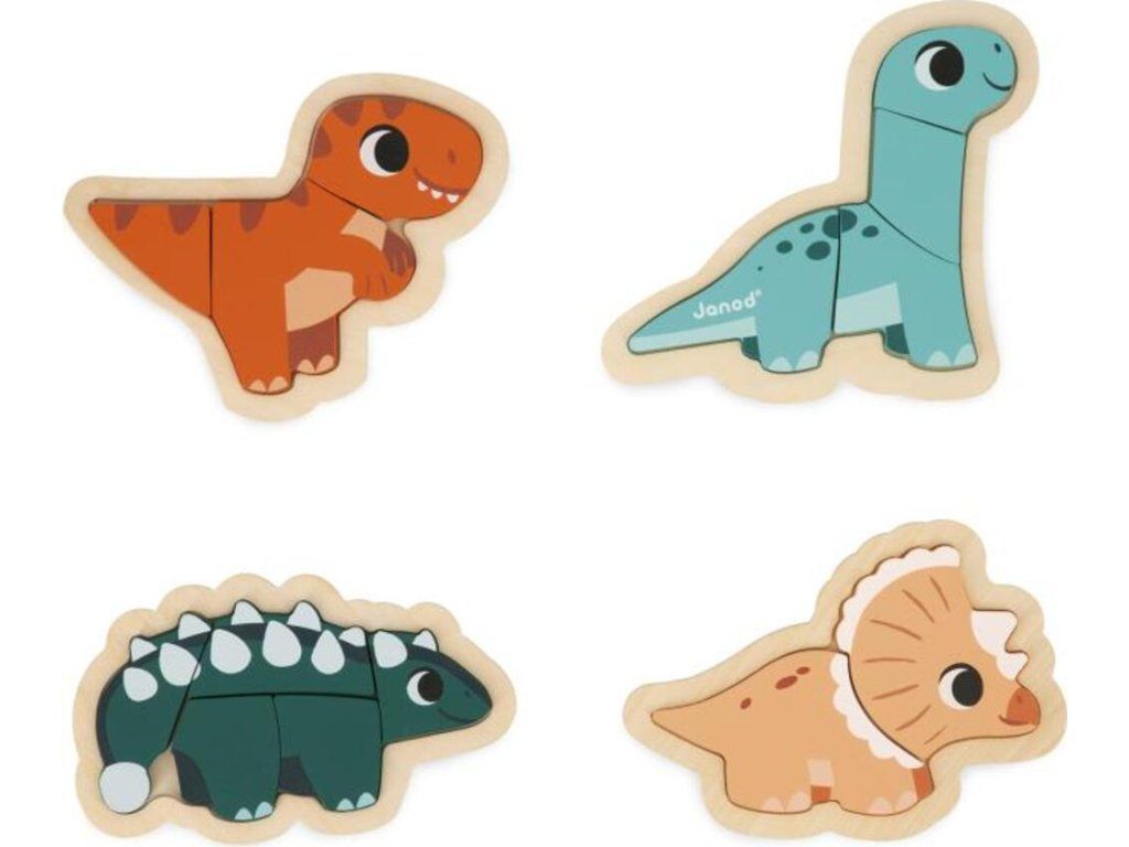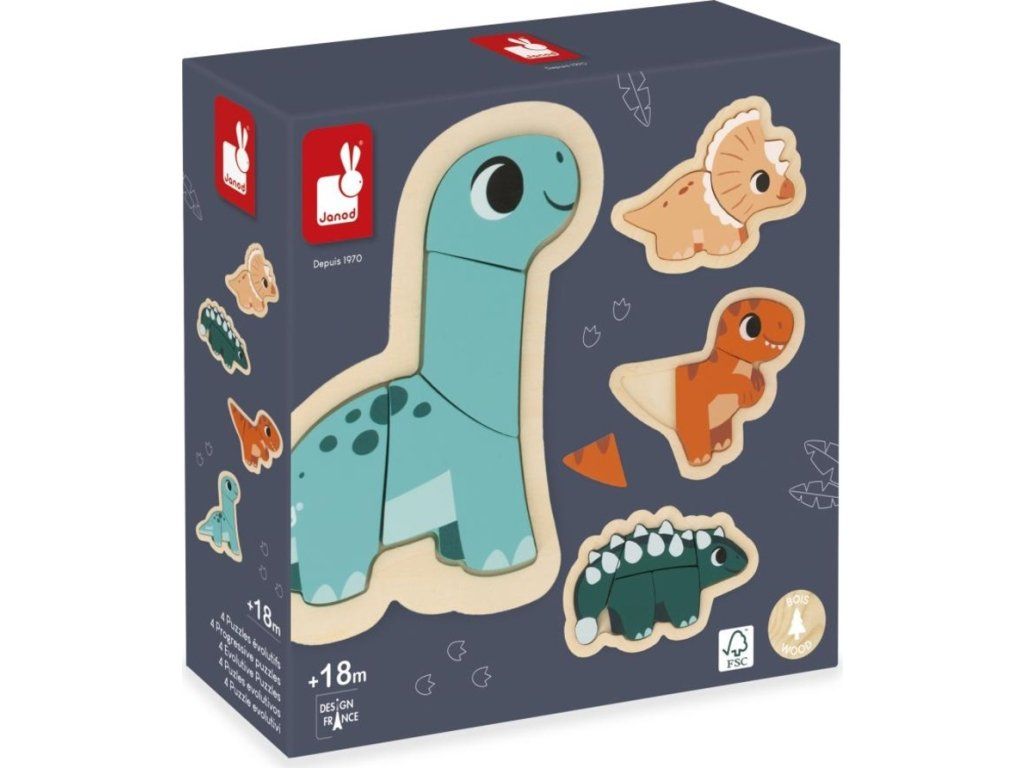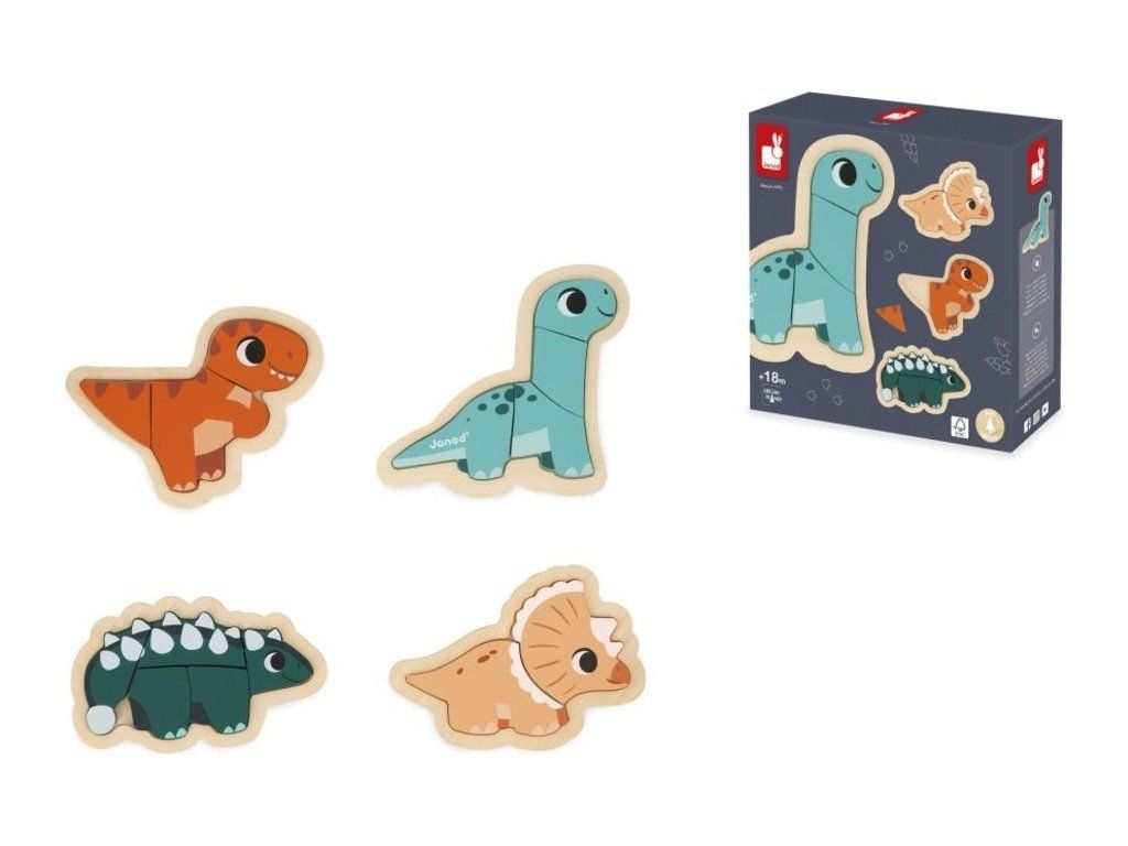 Tato skvělá sada se skládá ze 4 rostoucích puzzle představujících 2dílného Triceratopse, 3dílného T-Rexe, 4dílného Diplodoka a 5dílného Ankylosaura.