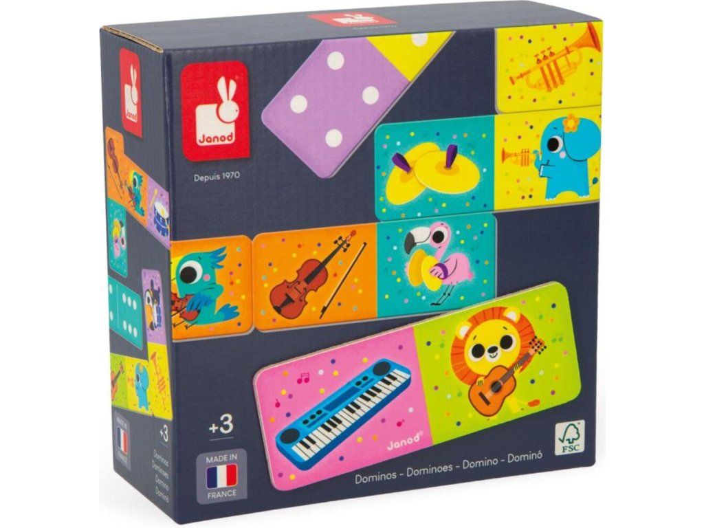 Tato domino hra obsahuje 28 dílků a je zábavná a zároveň vzdělávací. Spojte buď stejné zvíře nebo jeho hudební nástroj. Tato hra se také hraje se vzorem kostky na zadní straně figurek.