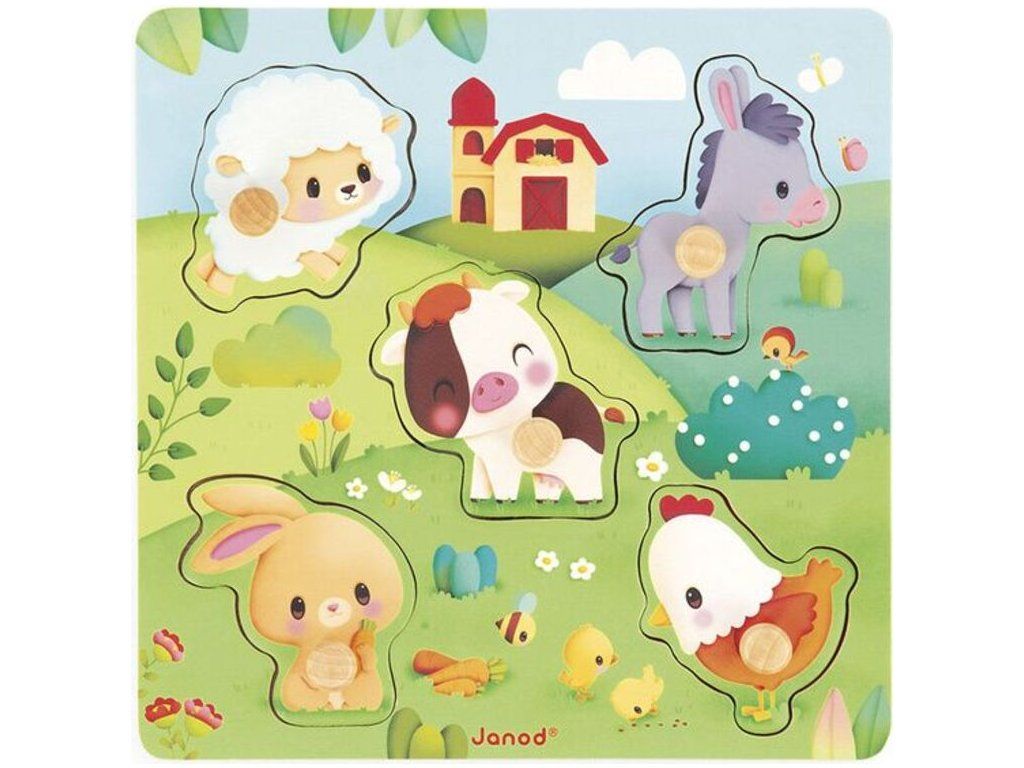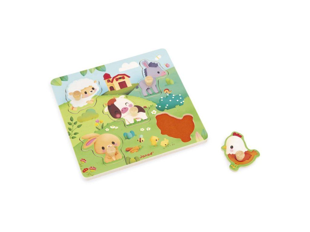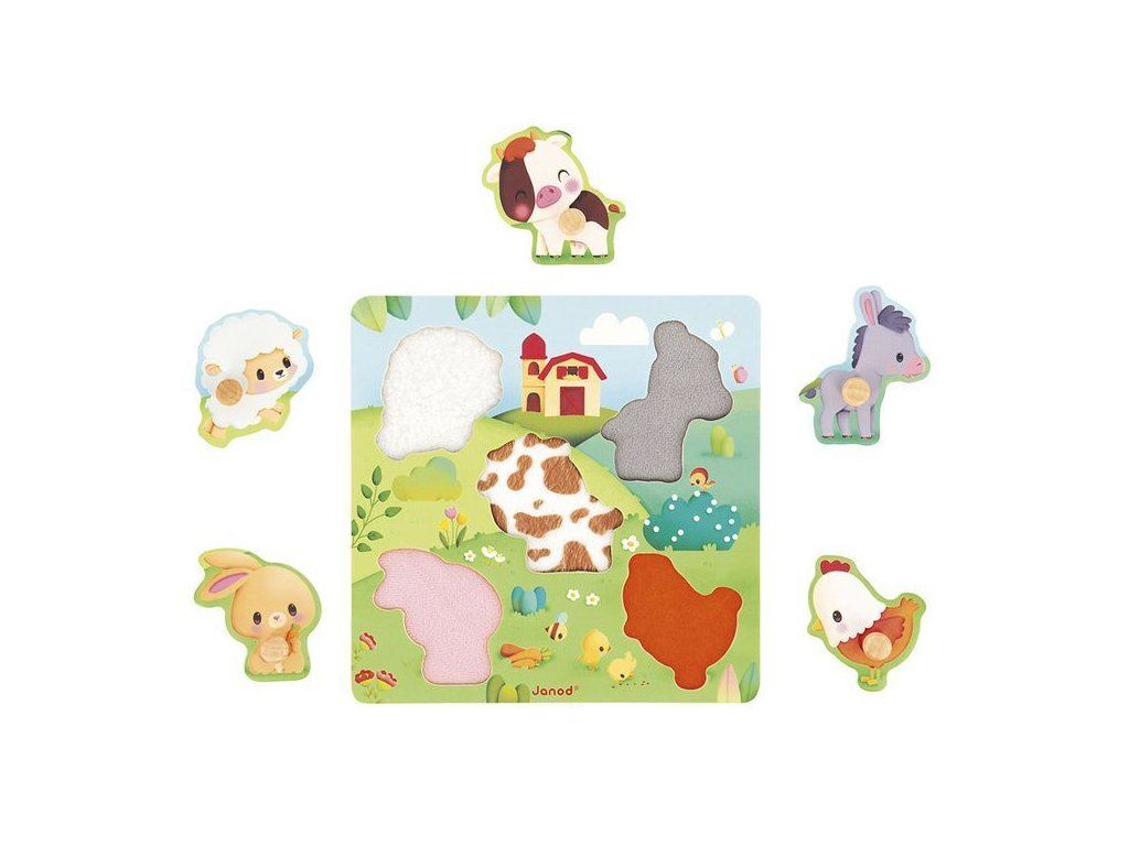 Dřevěné senzorické puzzle ze série Farma francouzské značky JANOD jsou skvělým prvním puzzle pro vaše batole.