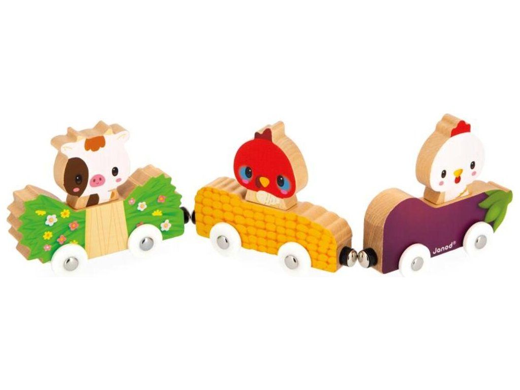 Zvířata žijící na louce i ve stáji milují závody na farmě! Tato magnetická hračka se skládá ze 3 aut (lilek, kukuřice a luční kvítí) a 3 dřevěných postaviček (kuře, krocan a kráva).