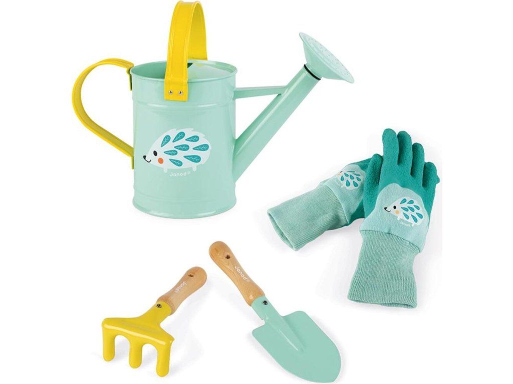 Balení obsahuje konev s motivem Ježka, rukavice s motivem Ježka, hrábě a lopatku.