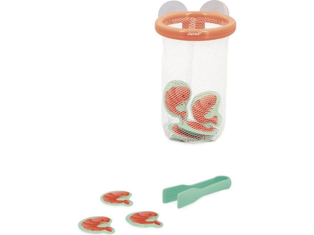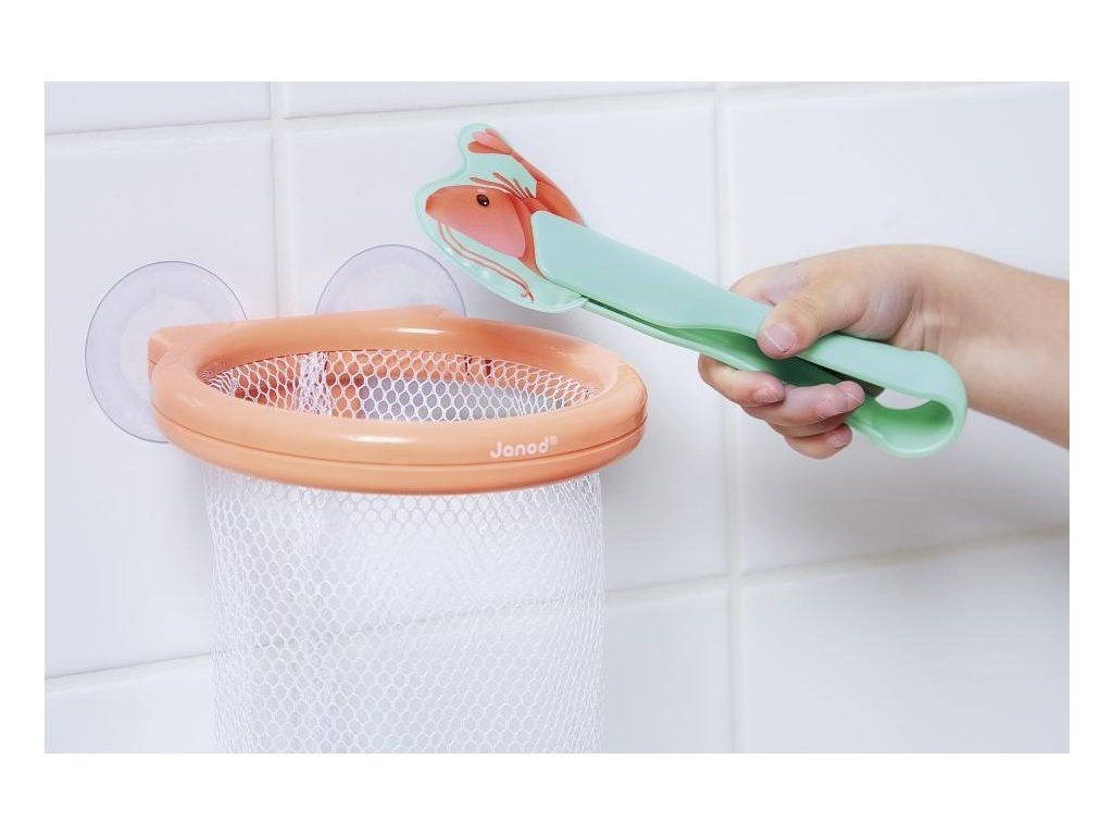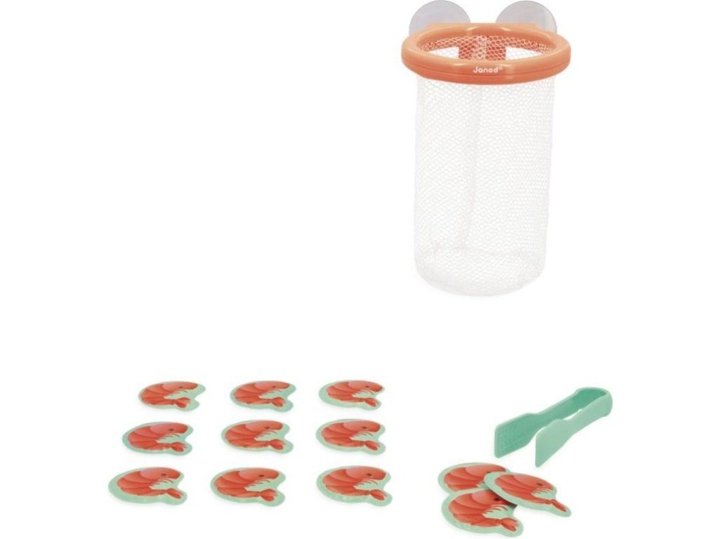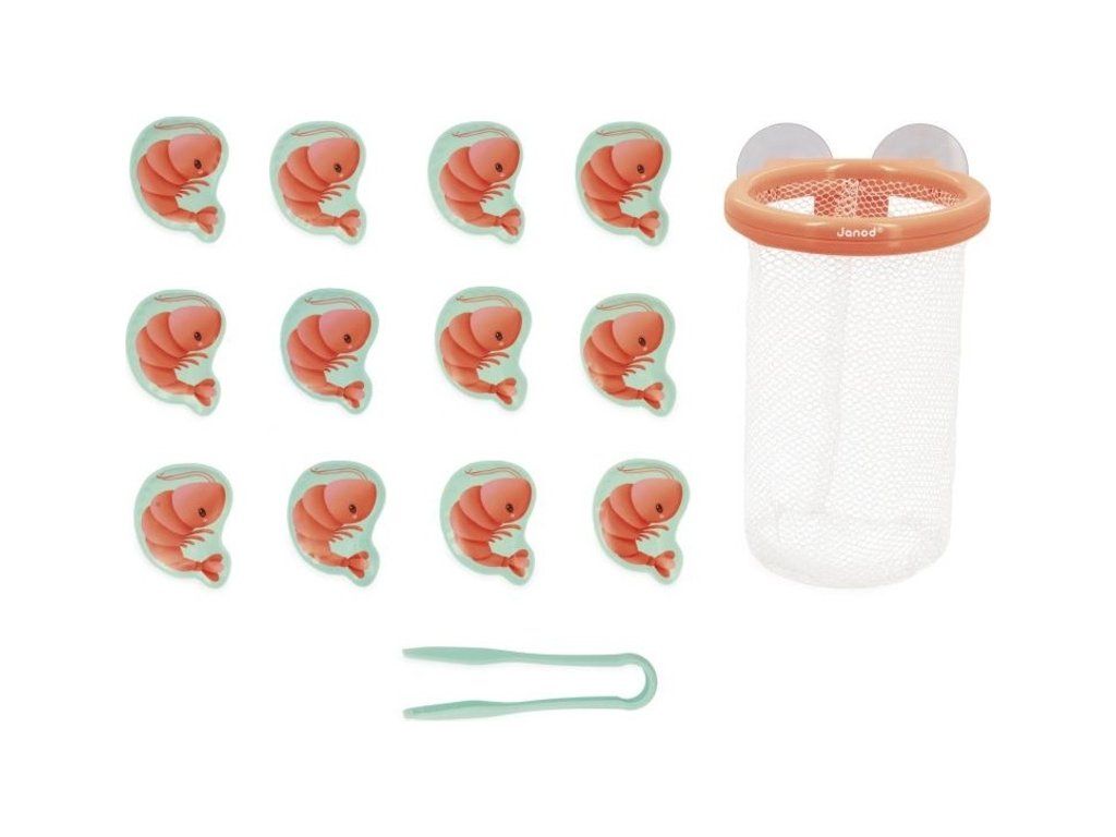 Pomocí malých kleští může vaše dítě chytit každou krevetu, která plave na hladině vody, a umístit ji do pěkného košíku, který se pomocí přísavek přichytí na dlaždice.