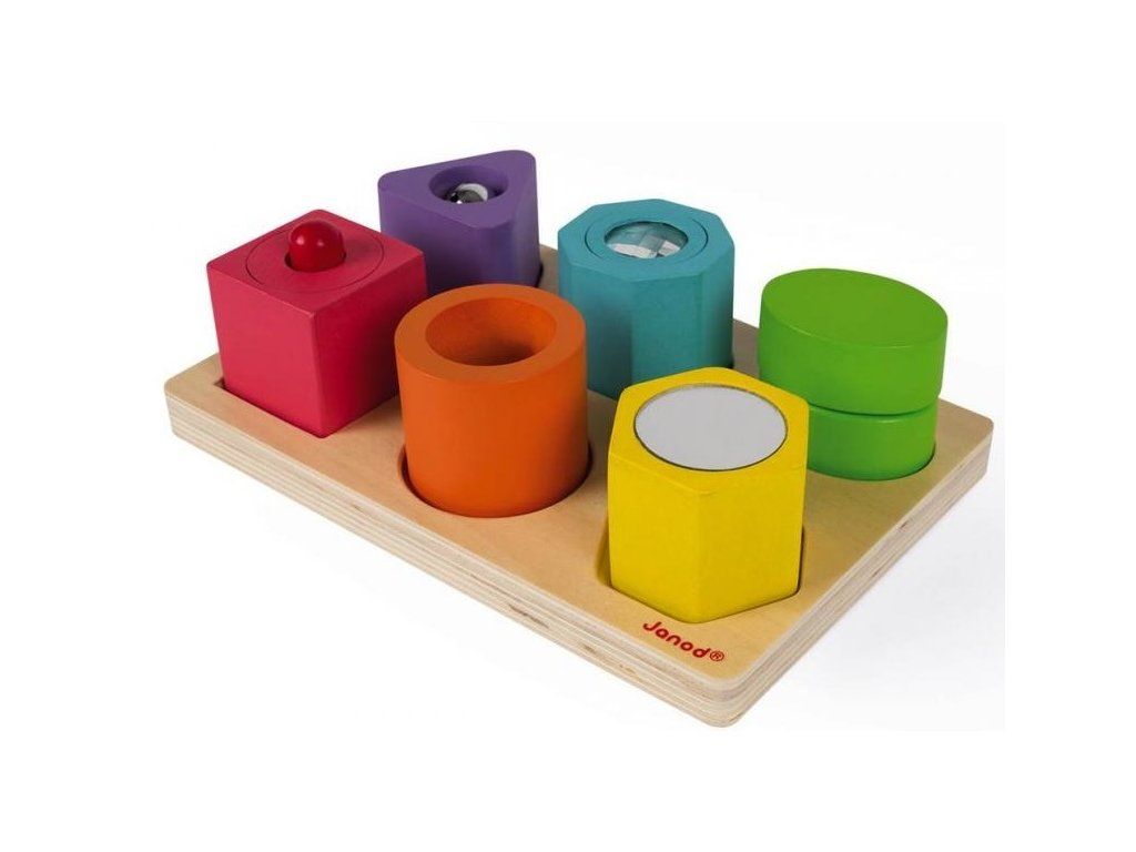 Dřevěná vkládačka pro nejmenší děti, se kterou se učí různé tvary a barvy. Každý dílek vydává nějaký zvuk nebo má jiný aktivní prvek, jako např. zrcátko a podobně.