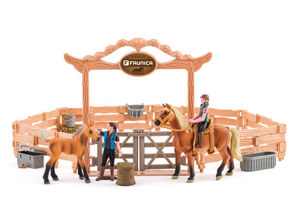 Ohrazení s westernovým vjezdem je to pravé prostředí pro trénink a výběh tvých koníků. Sada obsahuje koně s jezdcem, hříbě, ošetřovatele a další příslušenství. | Věk: 3+ | Velikost koně: 12 x 10 cm