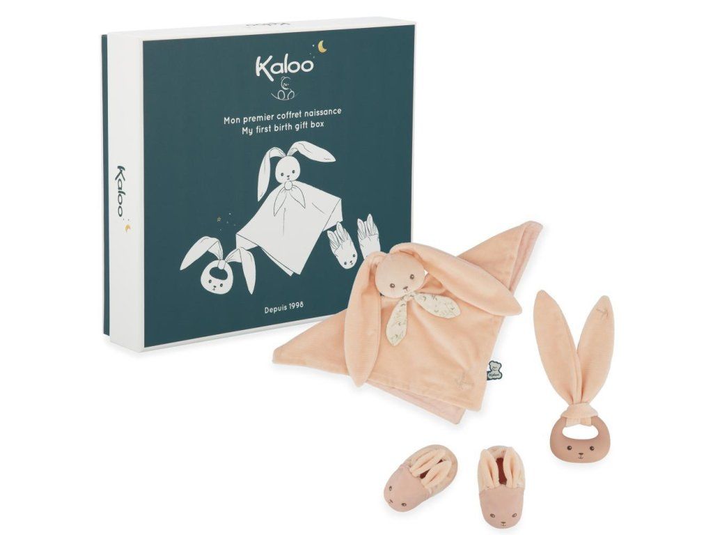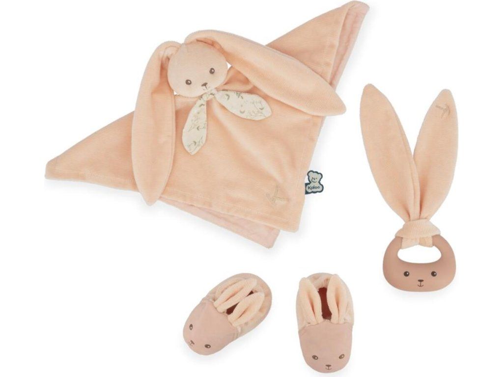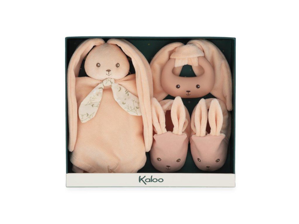 Kaloo Lapinoo Dárková sada pro miminko s chrastítkem kousátkem a capáčky broskvová