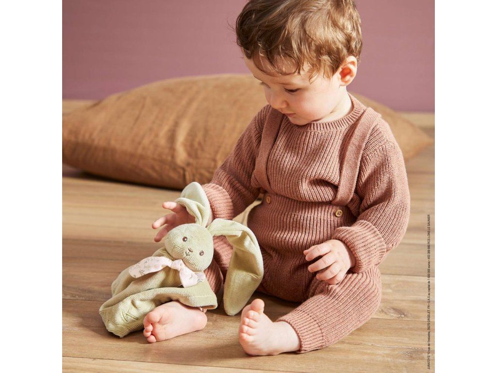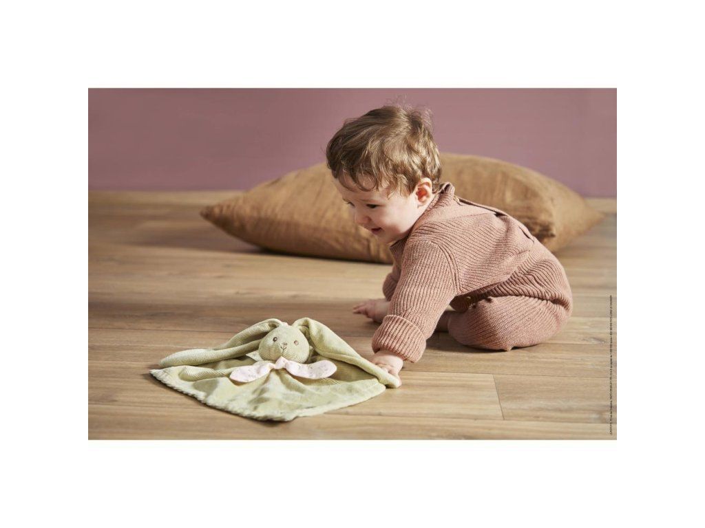 Veselý usínáček zelené barvy ze série Lapinoo bude dokonalým společníkem pro vaše miminko. Je ušitý ze dvou materiálů manšestrové a lehké bavlněné látky, je dokonale přizpůsobený pro jemné ručičky miminka. Má jednoduchý a jemný styl. Krásný květinový šátek pod hlavičkou mu dodává elegantní nádech.