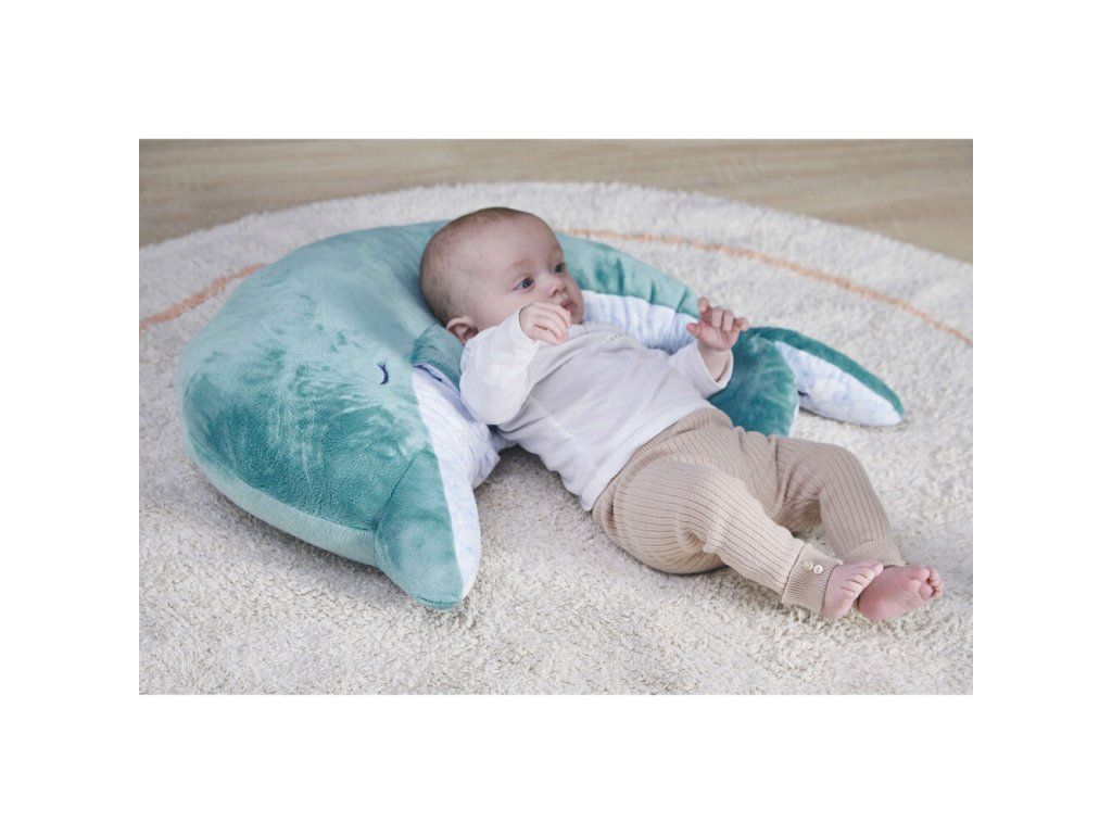 Je ideální pro doprovod miminka od jeho příchodu z porodnice, může pomoci mamince při kojení a tak předejít bolestem páteře a později zejména k uklidnění miminka. Když děťátko roste a učí se sedět a relaxovat, je obklopeno svým rozkošným plyšovým delfínem.