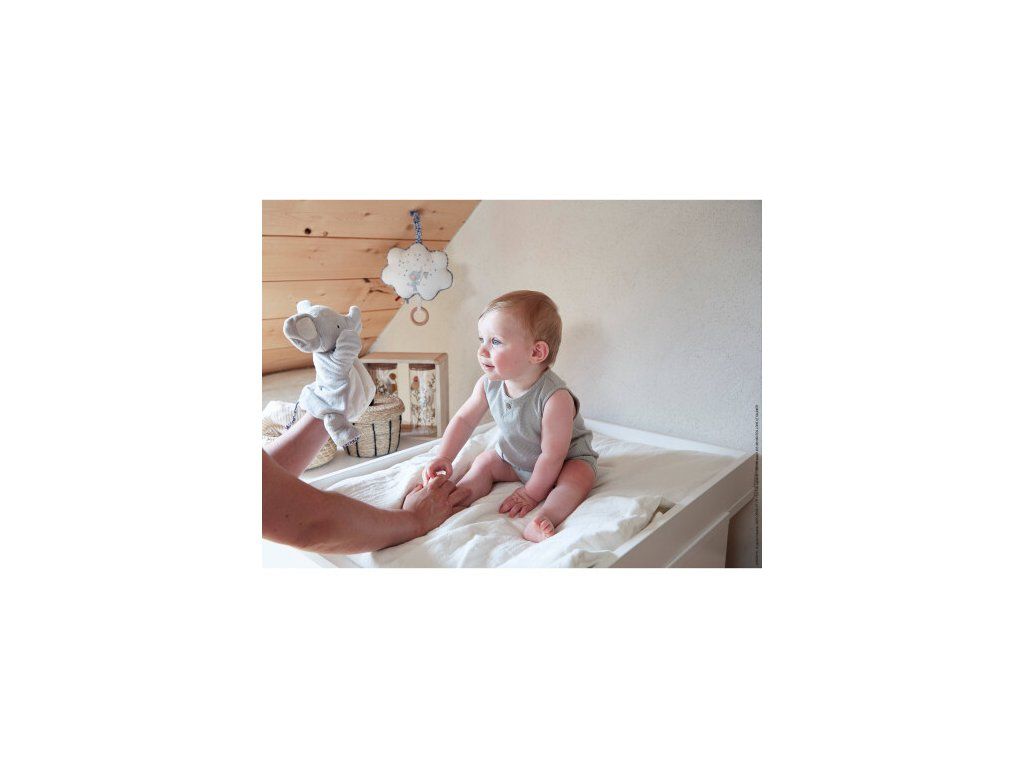 Látkový hudební obláček je jemně potištěný a vyšívaný vzorem sloníka a hvězdiček, polštářek je klíčovým prvkem pro vývoj miminka.