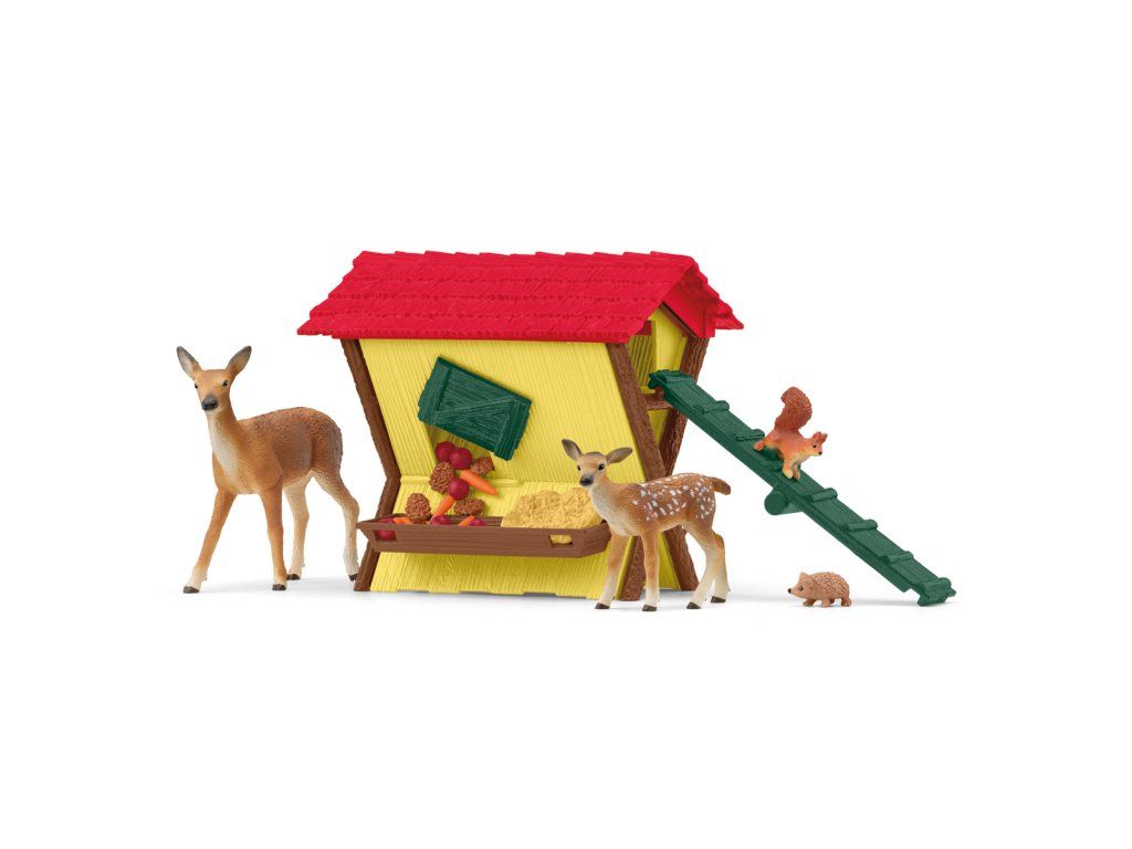 Zvířata v lese jsou maximálně spokojená, protože v krmelci vždy najdou něco k jídlu. Každý si tu najde něco: laň a její mládě mají radost z granulí, ale obě si pochutnají i na křupavé mrkvi. Rád se zastaví i plachý ježek. Veverka zvědavě proklouzne krmným poklopem do jeslí. Možná najde nějaký oříšek? V každém případě si našla útulný úkryt pod střechou. Tam nahoře také vidí lesního farmáře, který přijíždí ve svém autě (hrací sada se prodává samostatně). Balení: 19x15x8,5 cm. Věk: 3+