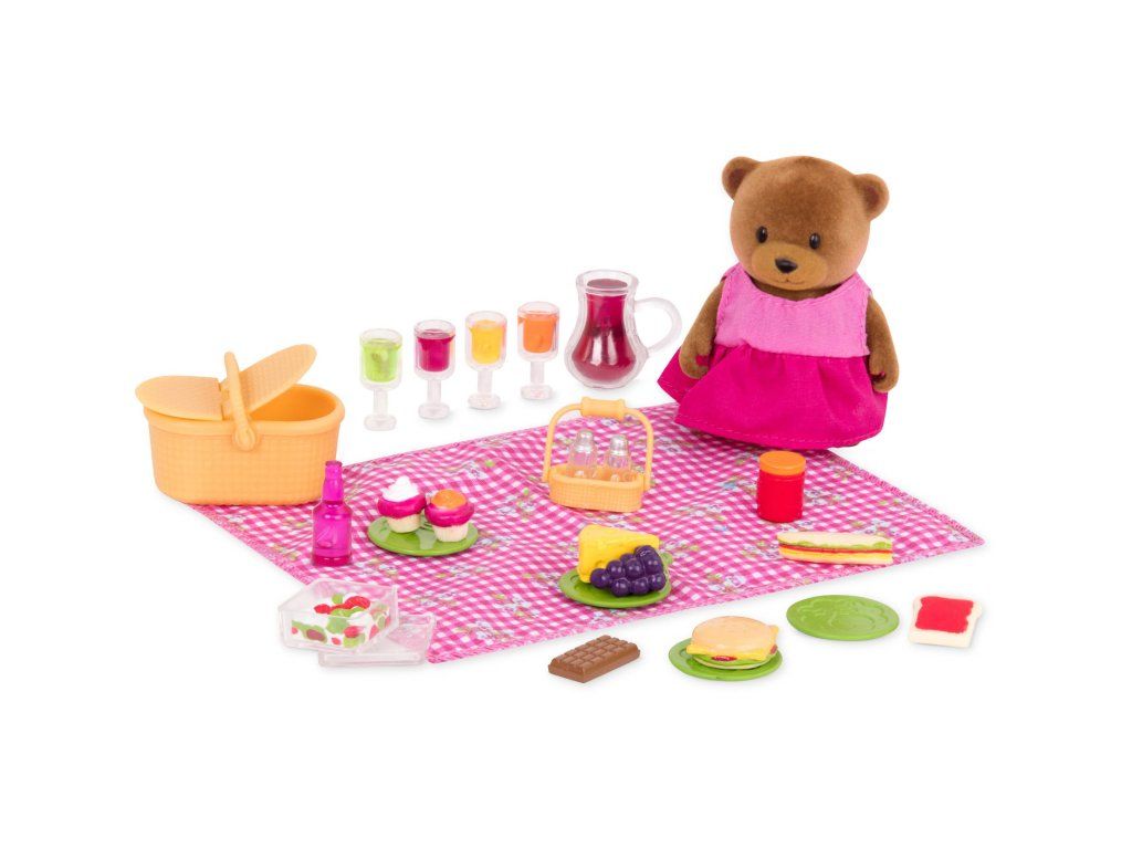 29dílná sada obsahuje: postavičku medvídka s oblečením, deku, piknikový košík, kousek sýra, 4 šálky, džbán na šťávu, solničku, pepřenku, stojánek na sůl a pepř, sklenici džemu, 2 košíčky, hrozen vína, tyčinku, chleba s marmeládou, porci salátu, nádobu na salát s víčkem, plněnou bagetu, hamburger a 4 talíře.