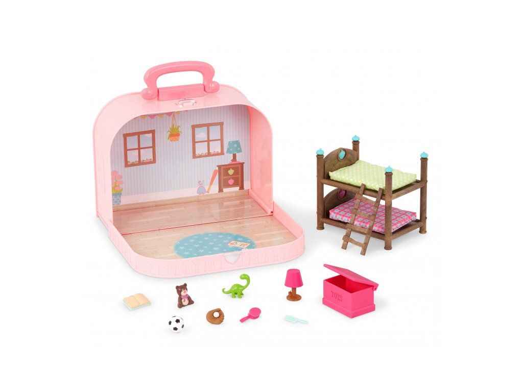 Cestovní sada hraček Li'l Woodzeeze v praktickém kufříku umožní vašemu dítěti hrát si kdekoli na dovolené, výletech či během víkendu u starých rodičů. Kufřík se po otevření promění v bohatě vybavený dětský pokoj s nábytkem a doplňky.
