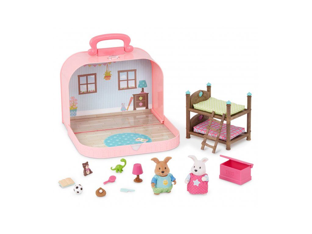 Cestovní sada hraček Li'l Woodzeeze v praktickém kufříku umožní vašemu dítěti hrát si se svými oblíbenými postavičkami kdekoli na dovolené, výletech či během víkendu u starých rodičů. Kufřík se po otevření promění v bohatě vybavený dětský pokoj s nábytkem, doplňky a postavičkami králíků Chucka a Amelie.