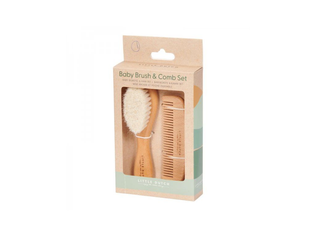 Sada pro každodenní péči o dětské vlásky obsahuje dřevěný kartáč s měkkými štětinami a hřeben se širokými zuby, které jsou šetrné k citlivé pokožce hlavy miminka.
