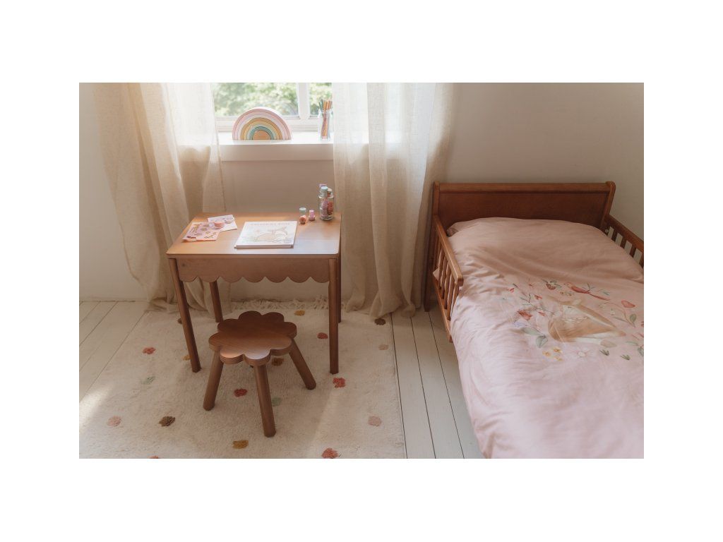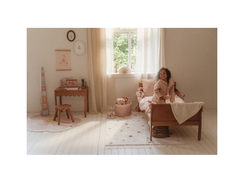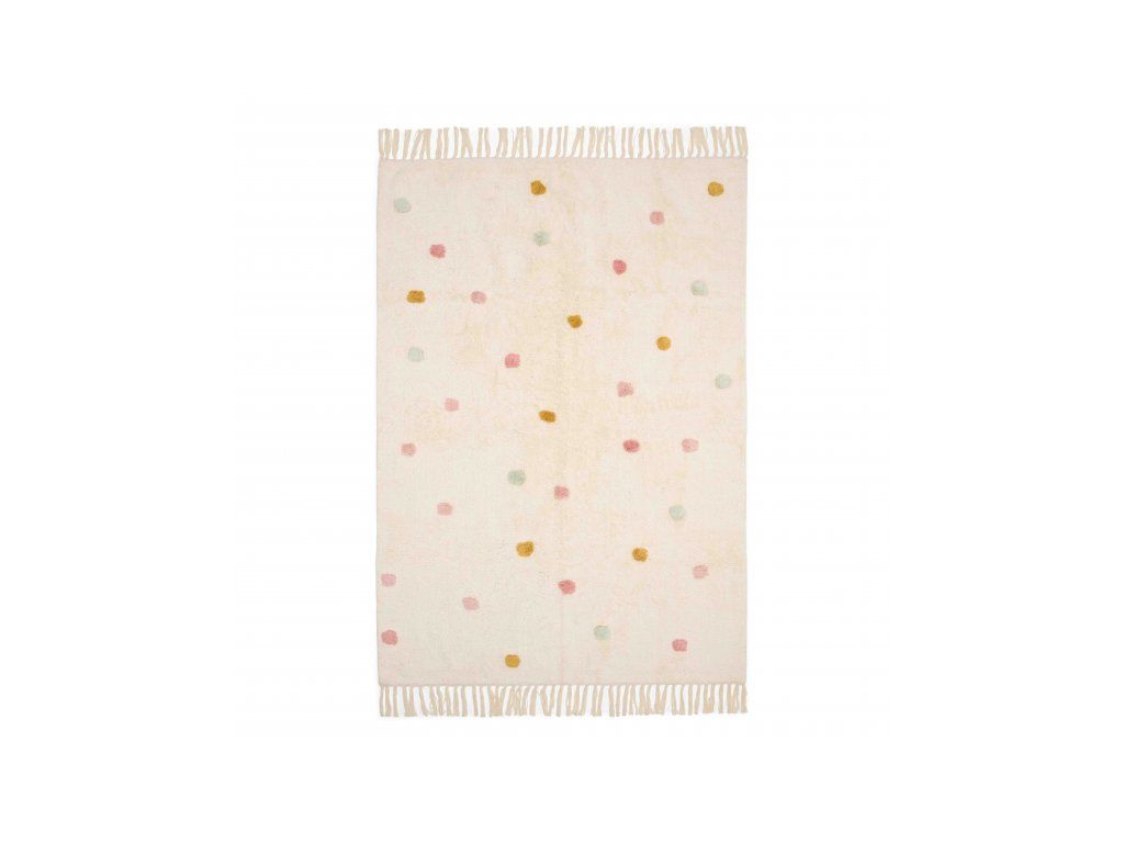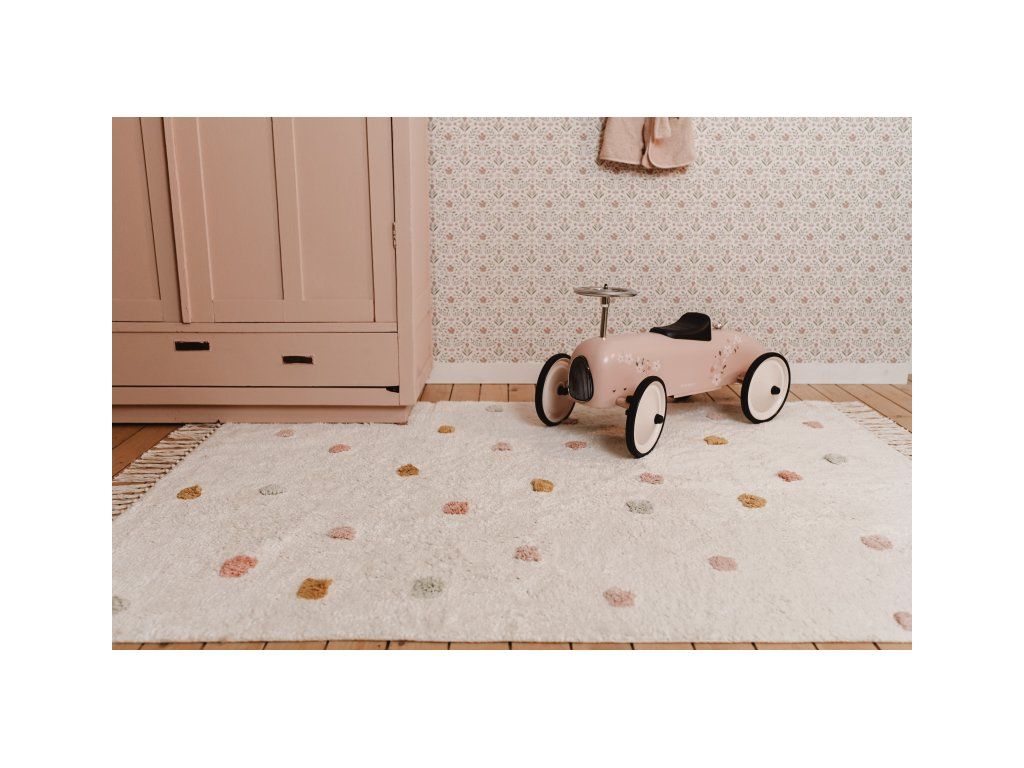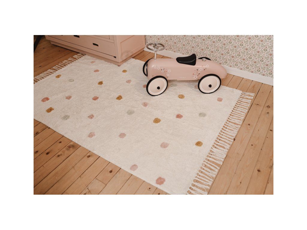 Vneste do dětského pokoje hřejivou a veselou atmosféru s koberečkem od značky Little Dutch! Koberec má béžový podklad zdobený hravými puntíky v růžové, modré a okrově žluté barvě. Třásně na kratších stranách dodávají designu útulný a originální vzhled.Vašemu dítěti se na něm bude krásně sedět a hrát si.