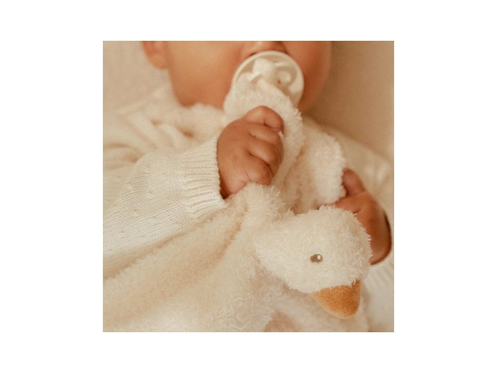 Plyšový muchláček s roztomilou husou a úchytem na dudlík láká ke hraní i mazlení. Mazlíček je vyroben z velmi jemného a příjemného materiálu a je ideální jako společník do postýlky pro klidné usínání.