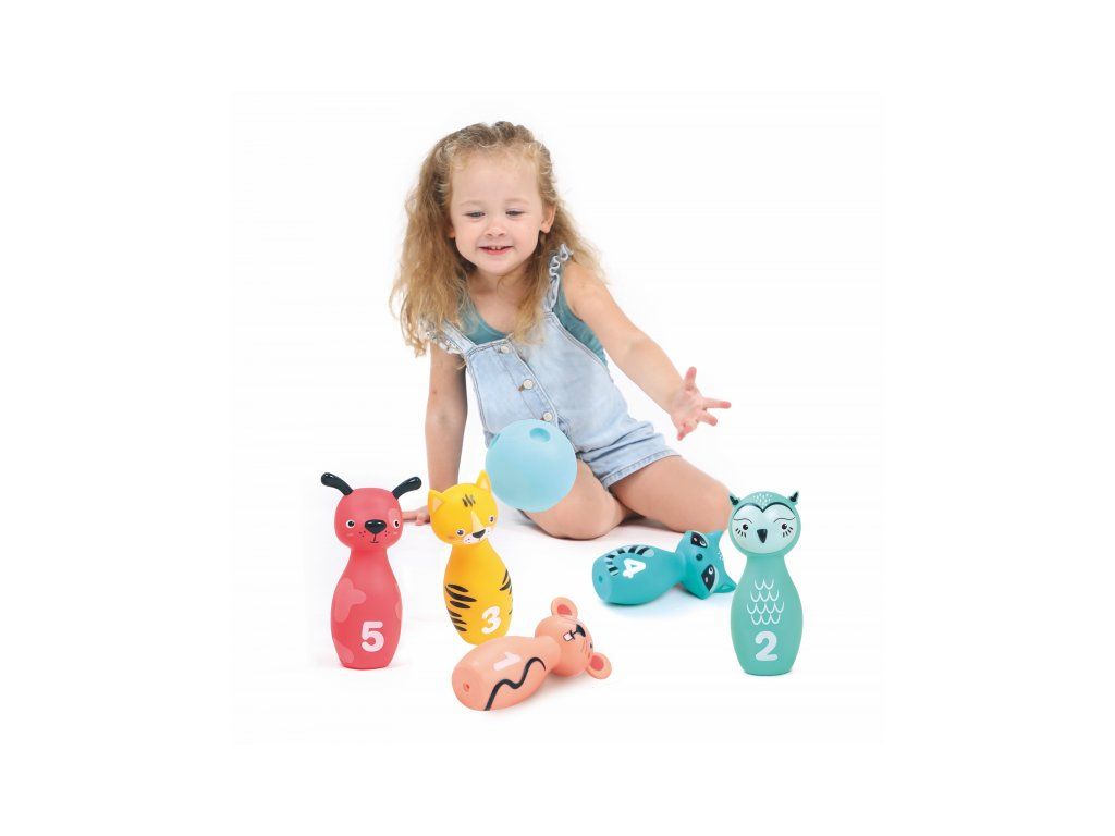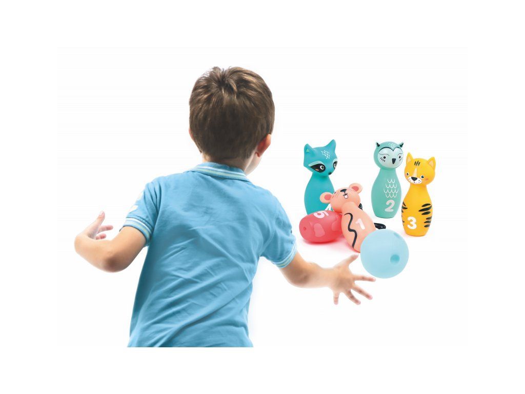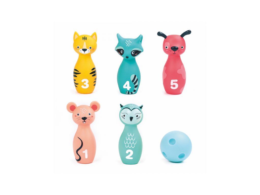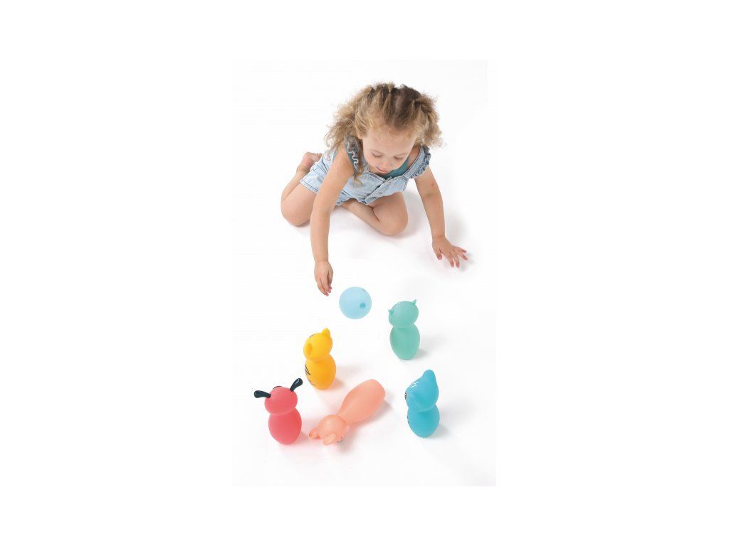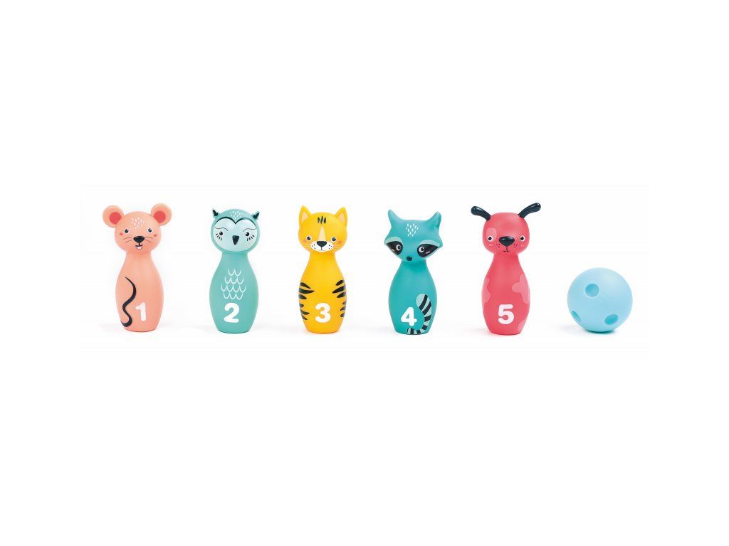 Sada obsahuje pět kuželek ve tvaru zvířátek s čísly a koulí s otvory pro uchopení jako pro skutečné hráče bowlingu.