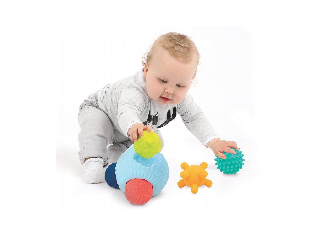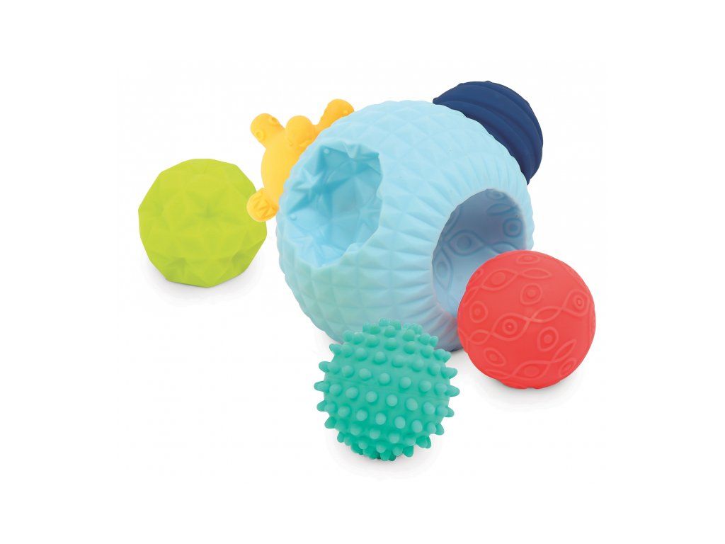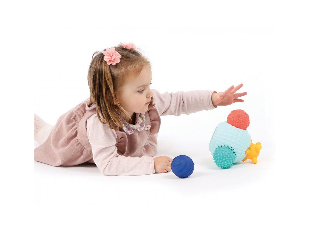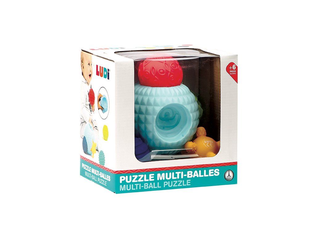 3D puzzle z míčků tvoří jeden velký míček s otvory a 5 menších míčků s různorodými texturami. Míčky, které se liší barvou, velikostí i povrchem, povzbuzují dětskou zvědavost a lákají ke zkoumání. Každý míček pasuje do jednoho z pěti otvorů ve velkém míčku. Děti budou nadšeně malé míčky z otvorů vytahovat a poté se snažit je vrátit na své místo.